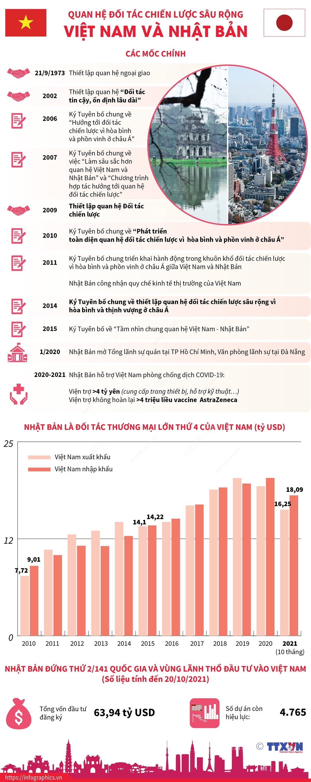 Từ ngày 22-25/11/2021, Thủ tướng Chính phủ Phạm Minh Chính thăm chính thức Nhật Bản theo lời mời của Thủ tướng Nhật Bản Kishida Fumio. Những năm gần đây, quan hệ Việt Nam và Nhật Bản phát triển nhanh chóng. Nhật Bản là đối tác kinh tế quan trọng hàng đầu của Việt Nam và là nước G7 đầu tiên công nhận quy chế kinh tế thị trường của Việt Nam (tháng 10/2011). Nhật Bản là nước tài trợ ODA lớn nhất, nhà đầu tư số 2 (tính theo số lũy kế), đối tác du lịch thứ 3, thương mại lớn thứ 4 của Việt Nam.