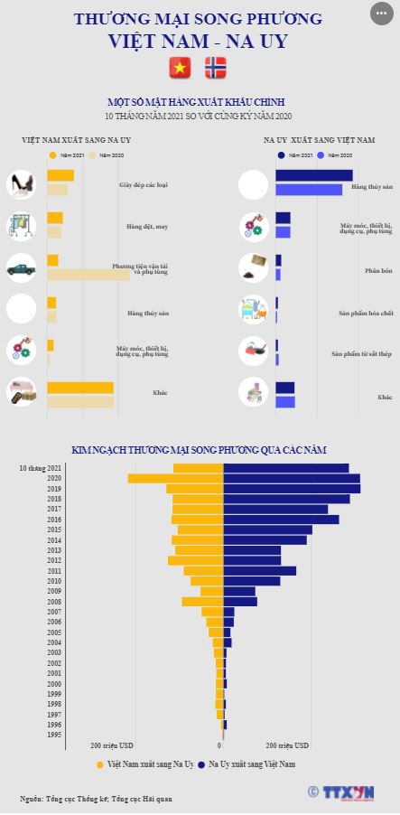 Cách đây tròn 50 năm, ngày 25/11/1971, Việt Nam và Na Uy chính thức thiết lập quan hệ ngoại giao. 50 năm qua, quan hệ giữa hai nước không ngừng phát triển trên tất cả các lĩnh vực: chính trị, kinh tế, văn hoá. Trong lĩnh vực kinh tế, những năm gần đây, kim ngạch thương mại Việt Nam-Na Uy tăng trưởng ấn tượng. Tổng kim ngạch thương mại giữa Việt Nam và Na Uy tăng 165 lần trong giai đoạn 1995-2020. Các mặt hàng xuất khẩu chủ lực của Việt Nam sang Na Uy gồm: Giày dép, dệt may, phương tiện vận tải và phụ tùng, thủy sản... Các mặt hàng xuất khẩu chính của Na Uy sang Việt Nam gồm: Thủy sản, máy móc thiết bị, phân bón, sản phẩm từ sắt thép...