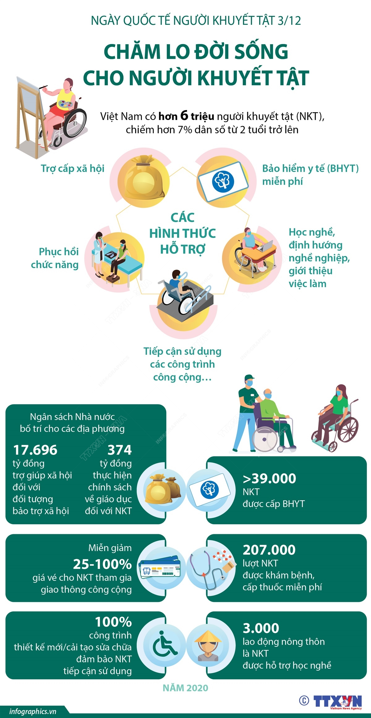 Ngày 3/12 hằng năm được Liên hợp quốc chọn là Ngày Quốc tế người khuyết tật. Những năm qua, Việt Nam đã triển khai nhiều hoạt động chăm lo cho người khuyết tật như hỗ trợ dạy nghề, tạo việc làm, xây dựng nhà ở cho người khuyết tật có hoàn cảnh khó khăn... Nhờ đó đã đem lại sức mạnh và niềm tin, giúp người khuyết tật có nghị lực vượt qua khó khăn, hòa nhập cộng đồng.