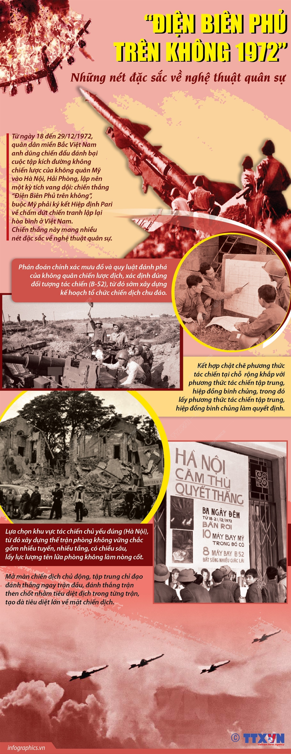 Từ ngày 18 đến 29/12/1972, quân dân miền Bắc Việt Nam anh dũng chiến đấu đánh bại cuộc tập kích đường không chiến lược của không quân Mỹ vào Hà Nội, Hải Phòng, lập nên một kỳ tích vang dội: chiến thắng “Điện Biên Phủ trên không”, buộc Mỹ phải ký kết Hiệp định Pari về chấm dứt chiến tranh lập lại hòa bình ở Việt Nam. Chiến thắng này mang nhiều nét đặc sắc về nghệ thuật quân sự.