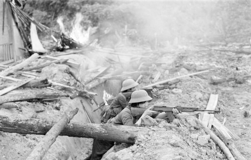 Chiến sỹ Đại đội 39, Đoàn 313 Hà Tuyên tổ chức tiêu diệt các ụ súng của quân xâm lược, tạo điều kiện thuận lợi cho bộ binh ta chiếm điểm cao. (Ảnh: Minh Lộc/TTXVN)