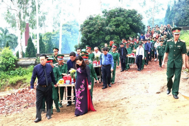 Lãnh đạo các Bộ, ngành Trung ương và tỉnh Hà Giang tiễn đưa hài cốt các liệt sỹ đã đã hy sinh trong cuộc chiến đấu bảo vệ biên giới phía Bắc về an nghỉ tại Nghĩa trang Liệt sỹ Quốc gia Vị Xuyên (29/6/2021). (Ảnh: Minh Tâm/TTXVN)