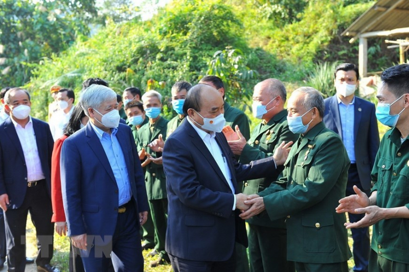 Chủ tịch nước Nguyễn Xuân Phúc thăm hỏi cựu chiến binh tại thôn Tân Bình, xã Việt Vinh, huyện Bắc Quang, tỉnh Hà Giang. (Ảnh: Minh Đức/TTXVN)