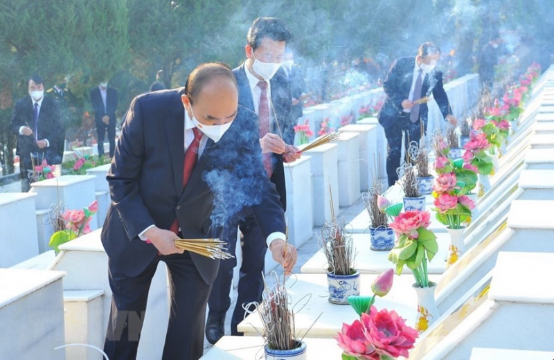 Chủ tịch nước Nguyễn Xuân Phúc dâng hương tưởng niệm các Anh hùng liệt sỹ tại Nghĩa trang Liệt sỹ Quốc gia Vị Xuyên (Hà Giang) ngày 8/12/2021. (Ảnh: Minh Đức/TTXVN)