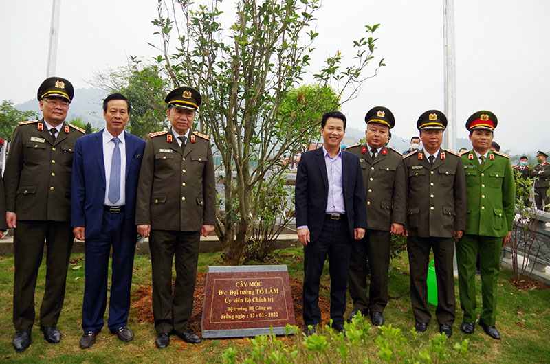 Bộ trưởng Tô Lâm cùng Đoàn công tác trồng cây lưu niệm tại Nghĩa trang liệt sỹ quốc gia huyện Vị Xuyên.