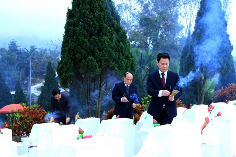 Lãnh đạo tỉnh Hà Giang thắp hương trên các phần mộ các liệt sỹ tại Nghĩa trang liệt sỹ Quốc gia Vị Xuyên (21/1/2020). (Ảnh: Minh Tâm/TTXVN)