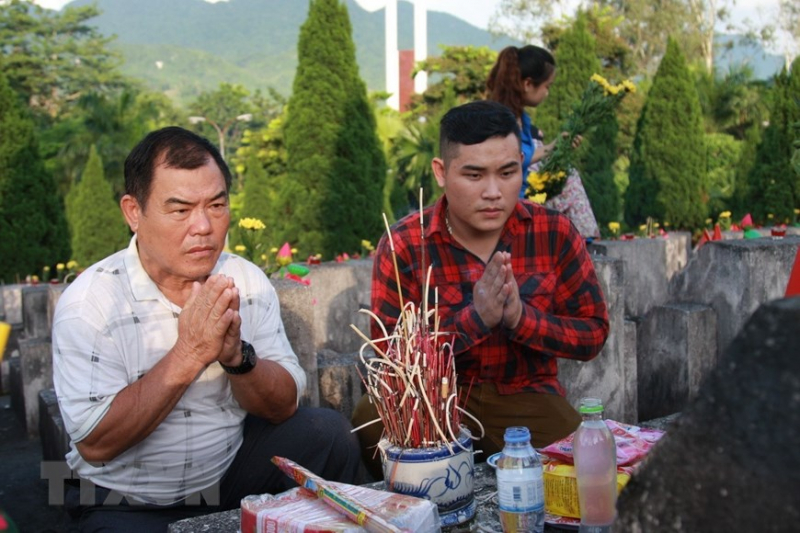 Cựu chiến binh và nhân dân thắp hương các liệt sỹ được an táng tại Nghĩa trang Liệt sỹ Quốc gia Vị Xuyên (Hà Giang). (Ảnh: Minh Tâm/TTXVN).
