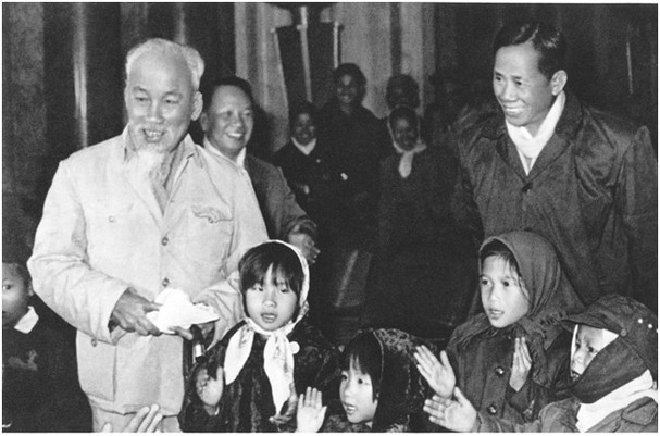 Chủ tịch Hồ Chí Minh, đồng chí Lê Duẩn và Chủ tịch Uỷ ban thường vụ Quốc hội Trường Chinh cùng các cháu thiếu nhi tại Phủ Chủ tịch, Hà Nội 1968 (Ảnh tư liệu).