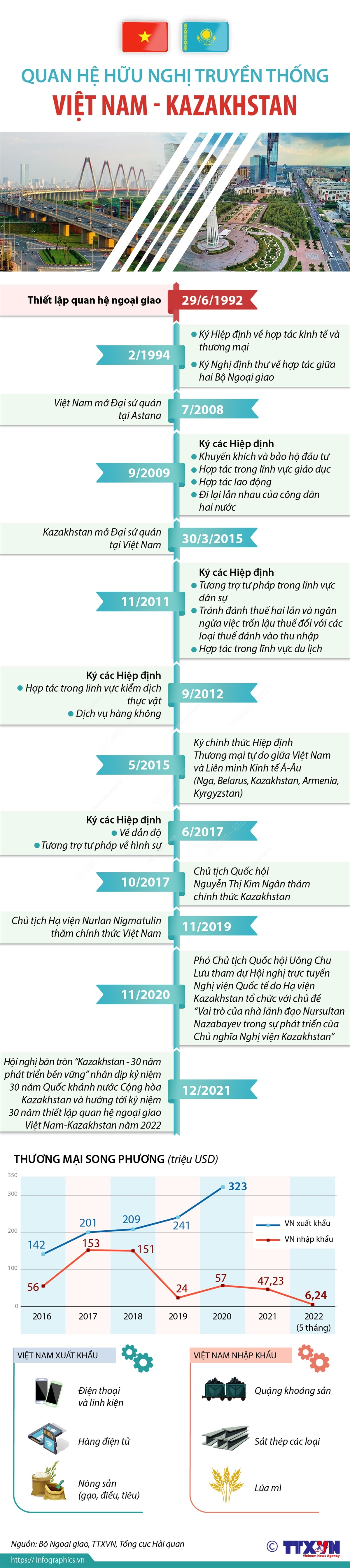Việt Nam và Kazakhstan chính thức thiết lập quan hệ ngoại giao cách đây 30 năm (29/6/1992-29/6/2022). Mối quan hệ hữu nghị, truyền thống tốt đẹp hiện nay của hai nước được kế thừa từ các thế hệ lãnh đạo hai nước và luôn được làm sâu sắc và không ngừng đi vào thực chất trên mọi lĩnh vực. Hai nước phối hợp hành động chặt chẽ và ủng hộ lẫn nhau tại Liên hợp quốc và các diễn đàn quốc tế khác.