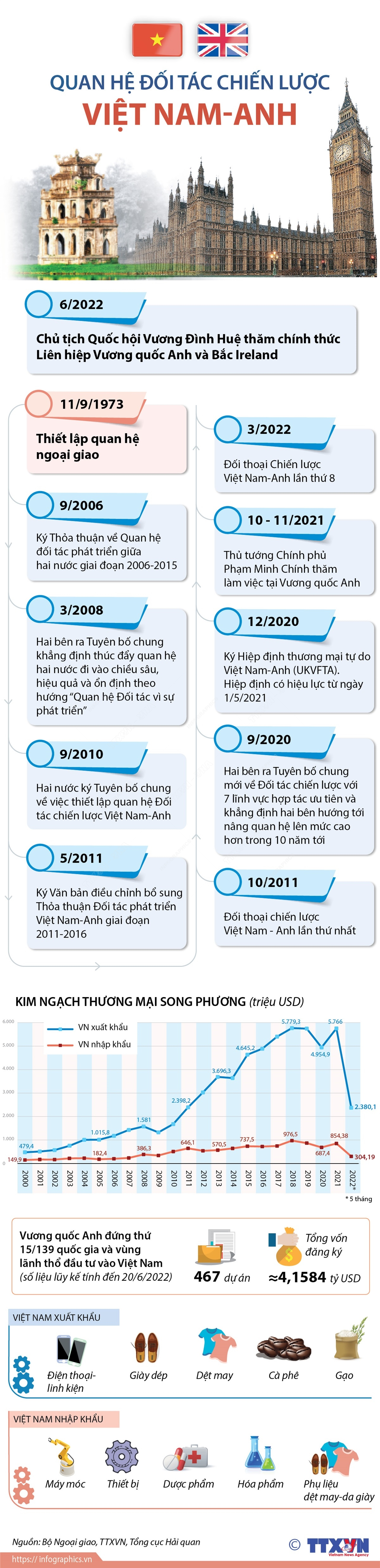 Kể từ khi thiết lập quan hệ đối tác chiến lược vào năm 2010 cho đến nay, hợp tác giữa Việt Nam và Anh ở cả phương diện song phương và đa phương đã có nhiều bước tiến tích cực trên các lĩnh vực, tiếp tục được kỳ vọng phát triển lên tầm cao mới trong thời gian tới.