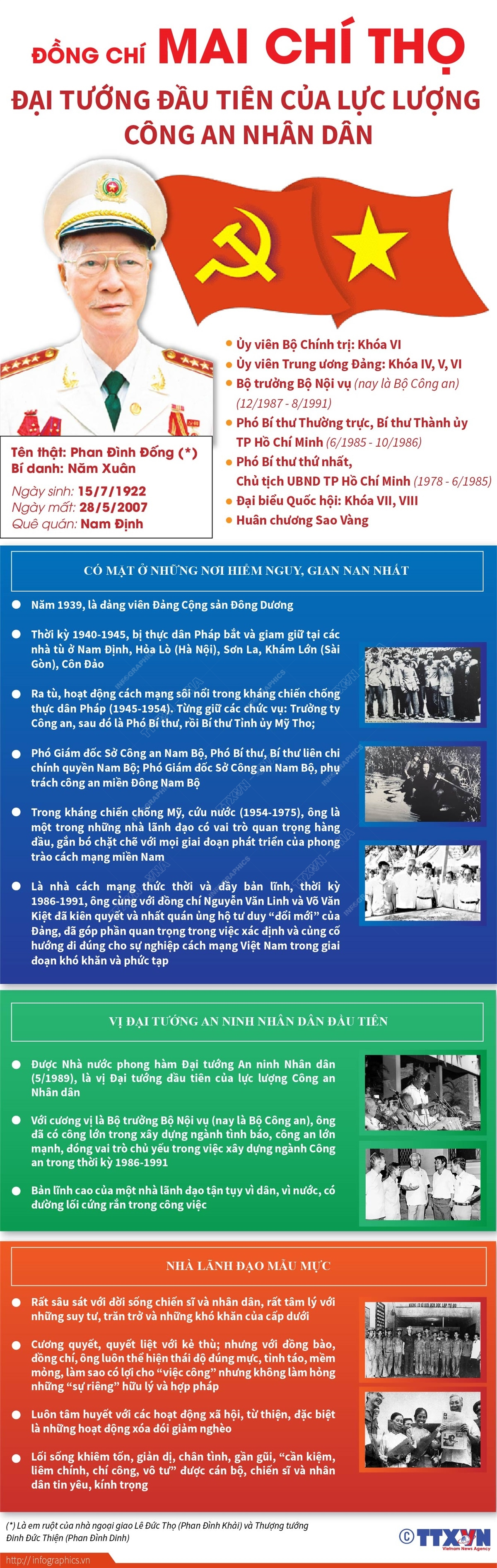 Hôm nay kỷ niệm 100 năm ngày sinh Đại tướng Mai Chí Thọ (15/7/1922 - 15/7/2022). Đồng chí là vị tướng đầu tiên của lực lượng Công an Nhân dân được phong hàm Đại tướng. Hơn 70 năm tham gia cách mạng, bằng trí tuệ và bản lĩnh của mình, đồng chí đã có những đóng góp xuất sắc vào sự phát triển của lực lượng Công an nói riêng và sự nghiệp cách mạng của dân tộc nói chung.