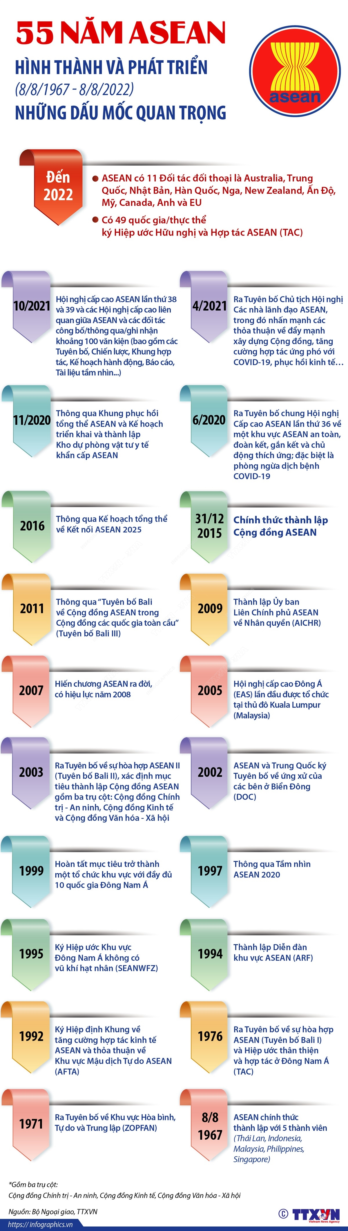 Trải qua 55 năm hình thành và phát triển (8/8/1967-8/8/2022), Hiệp hội các Quốc gia Đông Nam Á (ASEAN) đã ghi nhiều dấu mốc quan trọng trong tiến trình hợp tác, liên kết khu vực, với những thành tựu phát triển ngoài kỳ vọng. Các nước ASEAN đã luôn hỗ trợ, giúp đỡ và cùng nhau phát triển về mọi mặt, đưa Đông Nam Á trở thành khu vực của sự hợp tác, phát triển, tin cậy và hội nhập toàn cầu.
