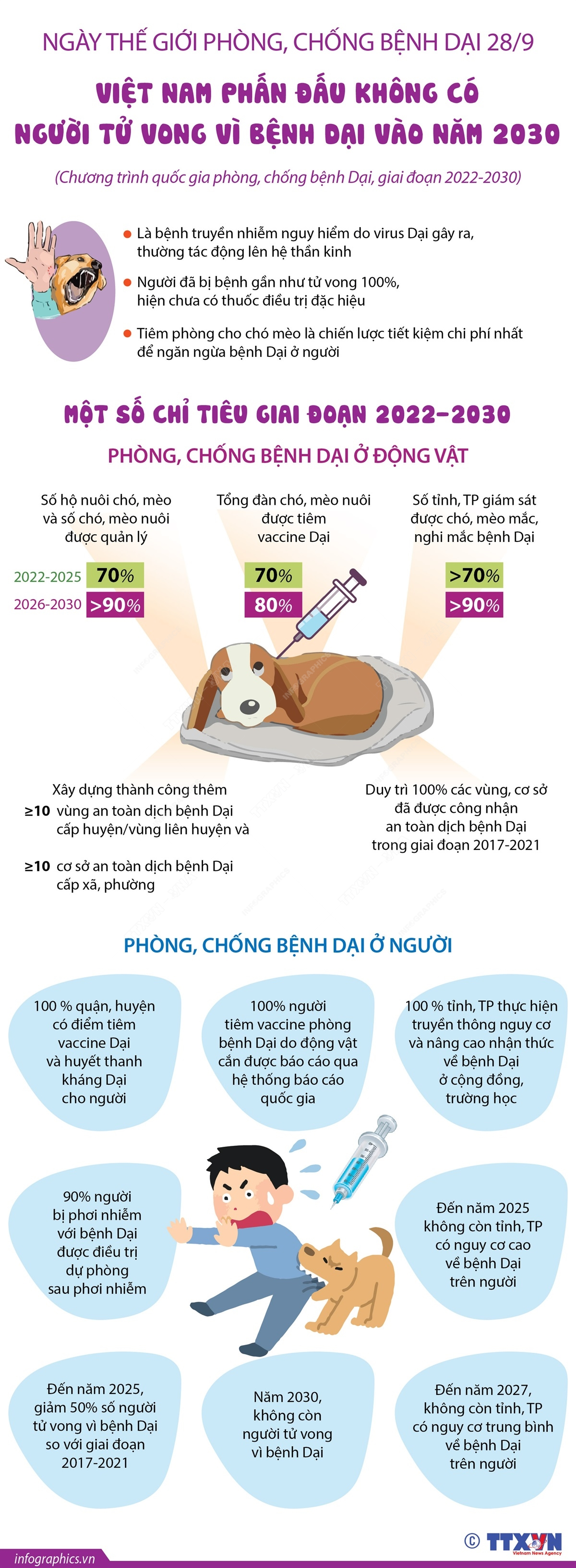 Thế giới phòng chống bệnh Dại được tổ chức hằng năm vào ngày 28/9 nhằm nâng cao hiểu biết và vận động cho việc loại trừ bệnh dại trên toàn cầu. Theo Chương trình quốc gia phòng, chống bệnh Dại, giai đoạn 2022-2030, Việt Nam phấn đấu kiểm soát được bệnh Dại trên đàn chó, mèo nuôi và không có người tử vong vì bệnh Dại vào năm 2030.