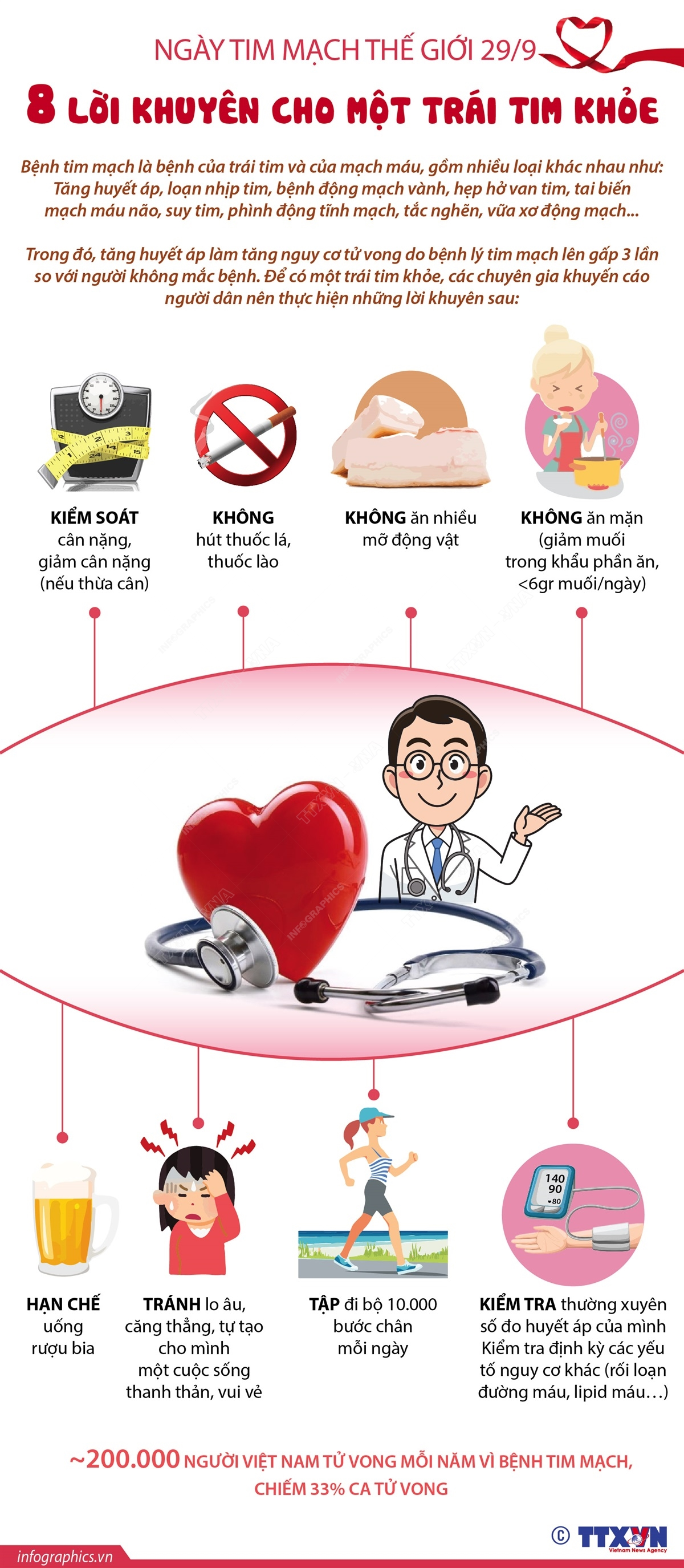 Ngày Tim mạch thế giới được tổ chức hằng năm vào ngày 29/9 nhằm tuyên truyền phổ biến, nâng cao nhận thức của cộng đồng về tăng cường sức khỏe tim mạch, phòng ngừa và tránh những rủi ro về sức khỏe tim mạch. Tại Việt Nam, theo thống kê của Bộ Y tế, có khoảng 200.000 người tử vong vì bệnh tim mạch mỗi năm, chiếm 33% ca tử vong. Để có một trái tim khỏe, các chuyên gia khuyến cáo người dân nên thực hiện những lời khuyên sau: