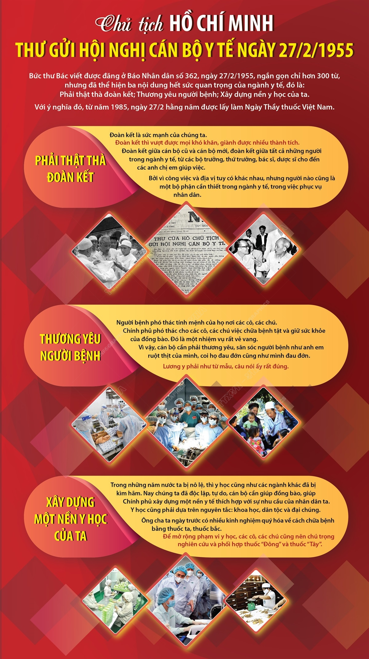Bức thư Bác viết gửi hội nghị cán bộ y tế được đăng trên Báo Nhân dân số 362, ngày 27/2/1955, ngắn gọn chỉ hơn 300 từ, nhưng đã thể hiện ba nội dung hết sức quan trọng của ngành y tế, đó là: Phải thật thà đoàn kết; Thương yêu người bệnh; Xây dựng nền y học của ta. Với ý nghĩa đó, từ năm 1985, ngày 27/2 hằng năm được lấy làm Ngày Thầy thuốc Việt Nam.