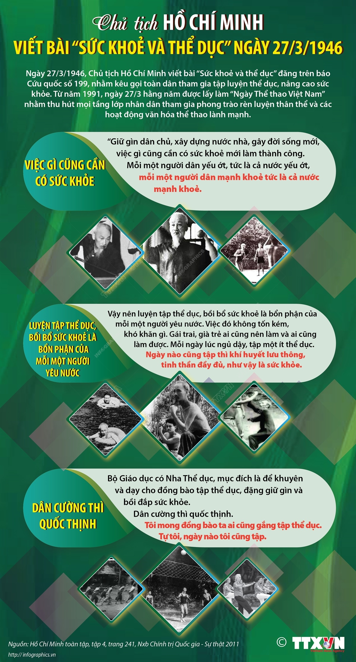 Ngày 27/3/1946, Chủ tịch Hồ Chí Minh viết bài “Sức khoẻ và thể dục” đăng trên báo Cứu quốc số 199, nhằm kêu gọi toàn dân tham gia tập luyện thể dục, nâng cao sức khỏe. Từ năm 1991, ngày 27/3 hằng năm được chọn là “Ngày Thể thao Việt Nam” nhằm thu hút mọi tầng lớp nhân dân tham gia phong trào rèn luyện thân thể và các hoạt động văn hóa thể thao lành mạnh.