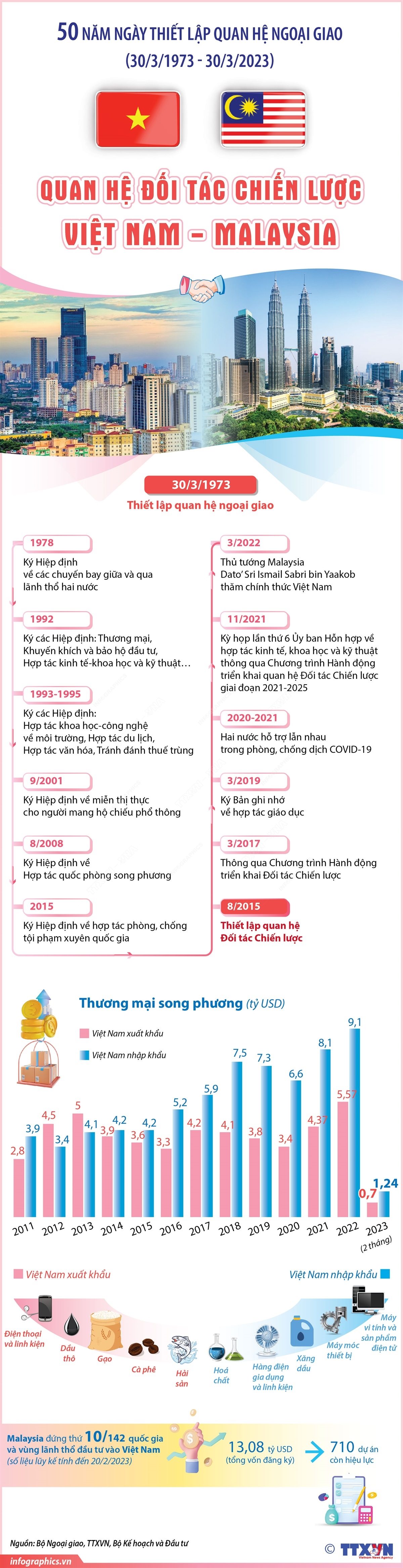 Nửa thế kỷ qua (30/3/1973 - 30/3/2023), quan hệ hợp tác giữa Việt Nam và Malaysia phát triển tích cực trên tất cả các lĩnh vực, đặc biệt là hợp tác kinh tế, thương mại. Cả hai nước đều là thành viên quan trọng, có tiếng nói trong ASEAN, tại các diễn đàn đa phương và quốc tế. Trong những năm qua, quan hệ hai nước phát triển tốt đẹp trên cơ sở Đối tác chiến lược được thiết lập từ tháng 8/2015. Malaysia hiện là nhà đầu tư nước ngoài lớn thứ 10 vào Việt Nam với số vốn đầu tư 13,08 tỷ USD trong hơn 700 dự án tại Việt Nam.