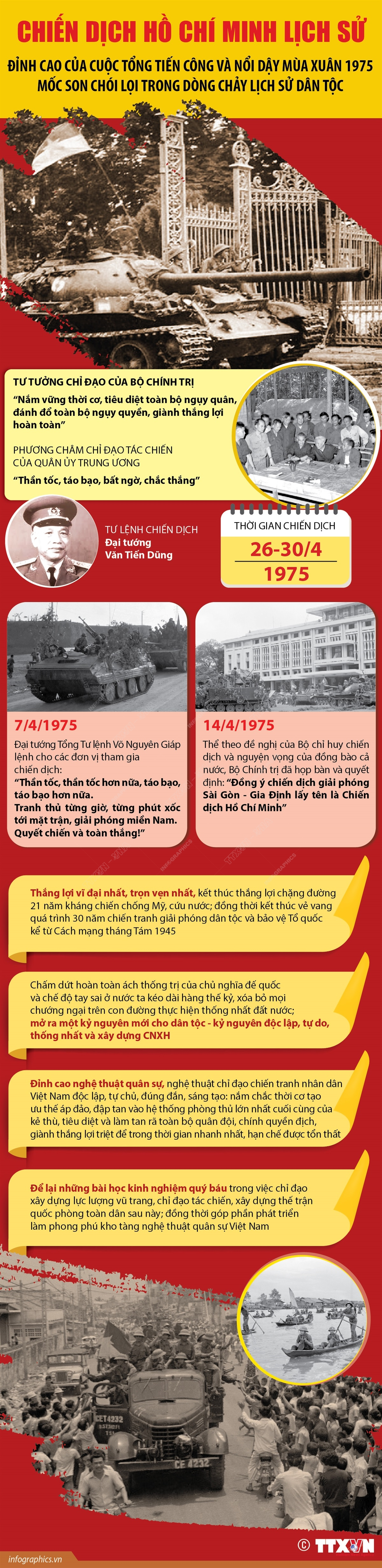 Ngày này cách đây 48 năm, ngày 26/4/1975, Chiến dịch Hồ Chí Minh chính thức mở màn. Đây là chiến dịch quyết chiến chiến lược lớn nhất của quân và dân ta đánh vào trung tâm đầu não quan trọng nhất của chính quyền, quân đội nguỵ ở Sài Gòn-Gia Định và các vùng phụ cận, kết thúc thắng lợi cuộc kháng chiến chống Mỹ, cứu nước. Chiến thắng của cuộc Tổng tiến công và nổi dậy mùa Xuân 1975, mà đỉnh cao là Chiến dịch Hồ Chí Minh mãi mãi đi vào lịch sử, khẳng định tầm vóc vĩ đại của cuộc kháng chiến của nhân dân Việt Nam chống đế quốc Mỹ xâm lược, để lại nhiều bài học kinh nghiệm có giá trị lý luận và thực tiễn sâu sắc.