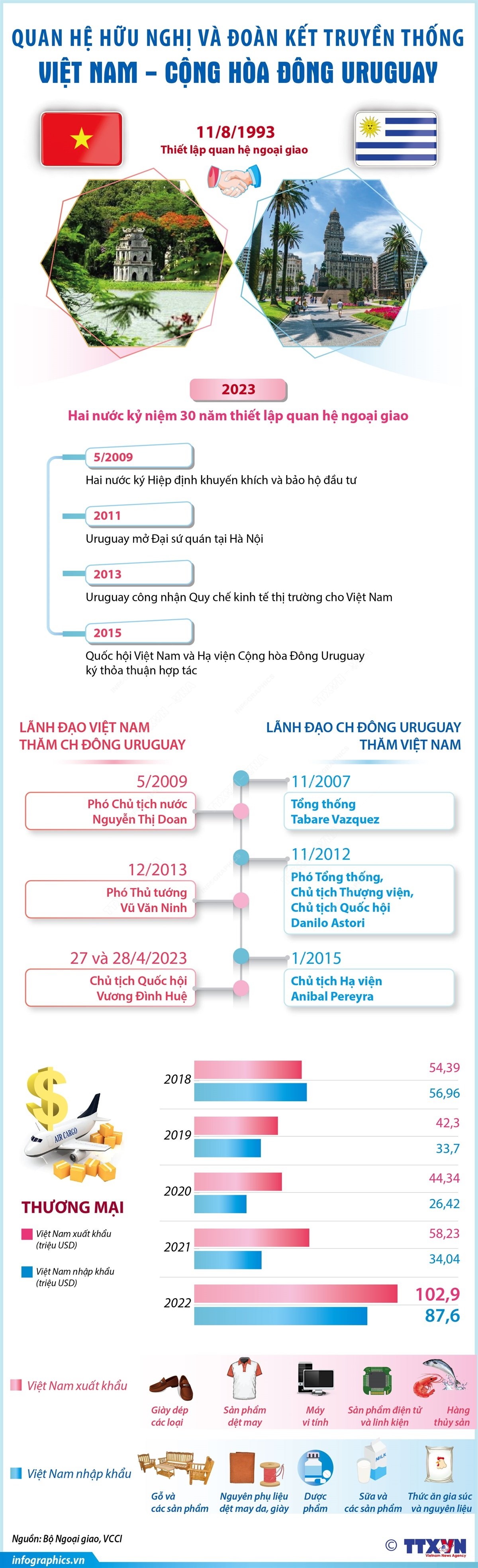 Nhận lời mời của Chủ tịch Thượng viện Đông Uruguay Beatriz Argimon Cedeira, Chủ tịch Quốc hội Vương Đình Huệ thăm chính thức Cộng hòa Đông Uruguay ngày 27 và 28/4/2023. Quan hệ hữu nghị và đoàn kết truyền thống giữa Việt Nam và Đông Uruguay được thể hiện qua sự ủng hộ lẫn nhau trong sự nghiệp giải phóng dân tộc trước đây cũng như phát triển đất nước hiện nay. Hai bên duy trì trao đổi đoàn, tiếp xúc song phương khá thường xuyên. Hai bên cũng thường xuyên ủng hộ lẫn nhau tại các diễn đàn khu vực và quốc tế trên nhiều vấn đề cùng quan tâm.