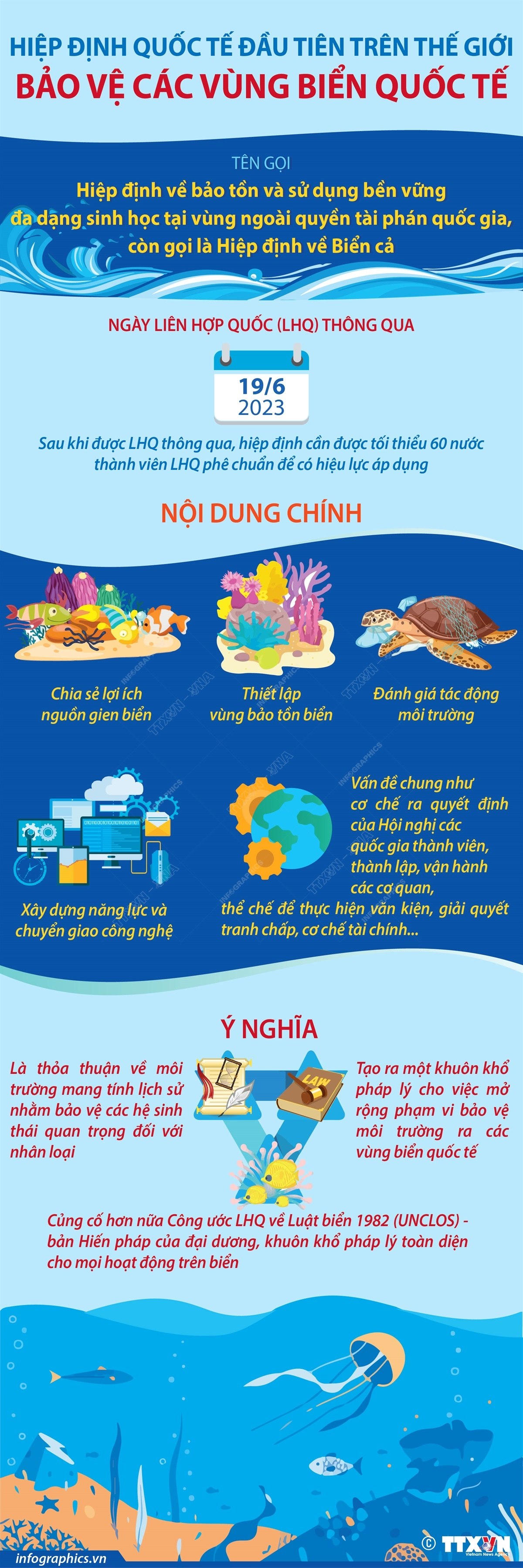 Hiệp định quốc tế đầu tiên trên thế giới bảo vệ các vùng biển quốc tế - với tên gọi Hiệp định về bảo tồn và sử dụng bền vững đa dạng sinh học tại vùng ngoài quyền tài phán quốc gia, còn gọi là Hiệp định về Biển cả - đã được thông qua tại Liên hợp quốc (LHQ) ngày 19/6/2023. Đây là một thỏa thuận về môi trường mang tính lịch sử được xây dựng nhằm bảo vệ các hệ sinh thái quan trọng đối với nhân loại. Đa số các nước đã hoan nghênh và ủng hộ mạnh mẽ việc thông qua hiệp định và thể hiện ý định sớm ký và phê chuẩn để hiệp định sớm có hiệu lực, được thực thi đầy đủ và hiệu quả.