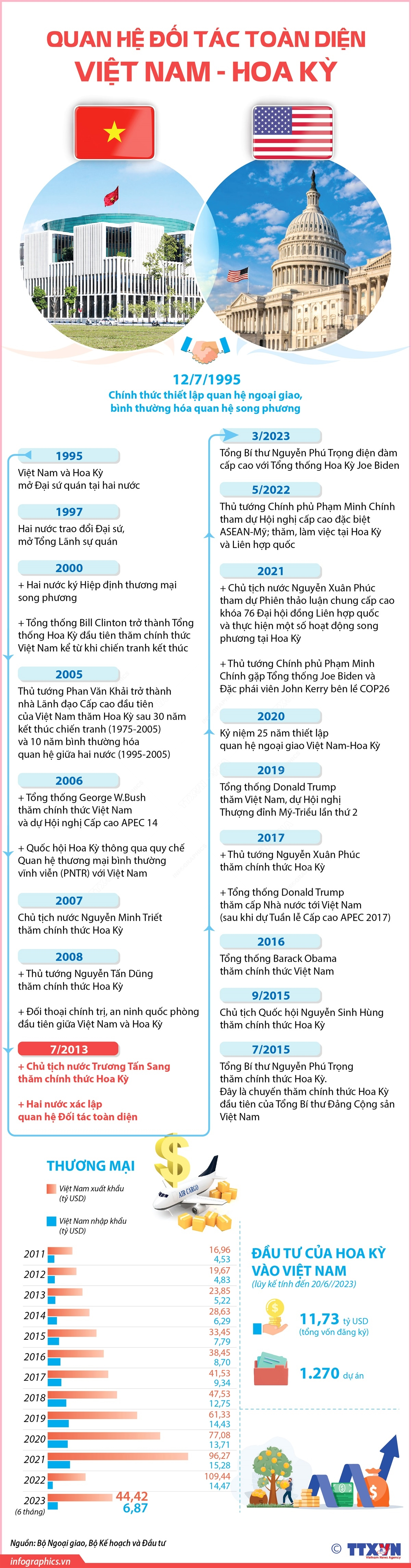 Tháng 7/2023 là dấu mốc quan trọng trong quan hệ Việt Nam và Hoa Kỳ - kỷ niệm 10 năm ngày hai nước thiết lập quan hệ Đối tác toàn diện (7/2013 - 7/2023). Sau 28 năm kể từ khi chính thức thiết lập quan hệ ngoại giao và tròn 10 năm kể từ khi xác lập quan hệ Đối tác toàn diện, quan hệ Việt Nam-Hoa Kỳ đã đạt được những bước phát triển toàn diện, thực chất, ngày càng đi vào chiều sâu, đóng góp tích cực cho an ninh, hòa bình, hợp tác và phát triển tại khu vực và trên thế giới. Hai nước đã trở thành đối tác toàn diện từ chính trị-ngoại giao, kinh tế, giáo dục, khoa học-công nghệ, đến quốc phòng-an ninh... với động lực hợp tác ngày càng mạnh mẽ.