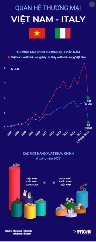 Việt Nam hiện là đối tác thương mại lớn nhất của Italy trong ASEAN và Italy là đối tác EU lớn thứ 4 của Việt Nam. Từ năm 2010 đến nay, kim ngạch thương mại hai chiều đã tăng gấp đôi. Năm 2022, dù có nhiều khó khăn, kim ngạch thương mại song phương vẫn đạt mức cao nhất từ trước đến nay là 6,2 tỷ USD, tăng 11% so với năm 2021.