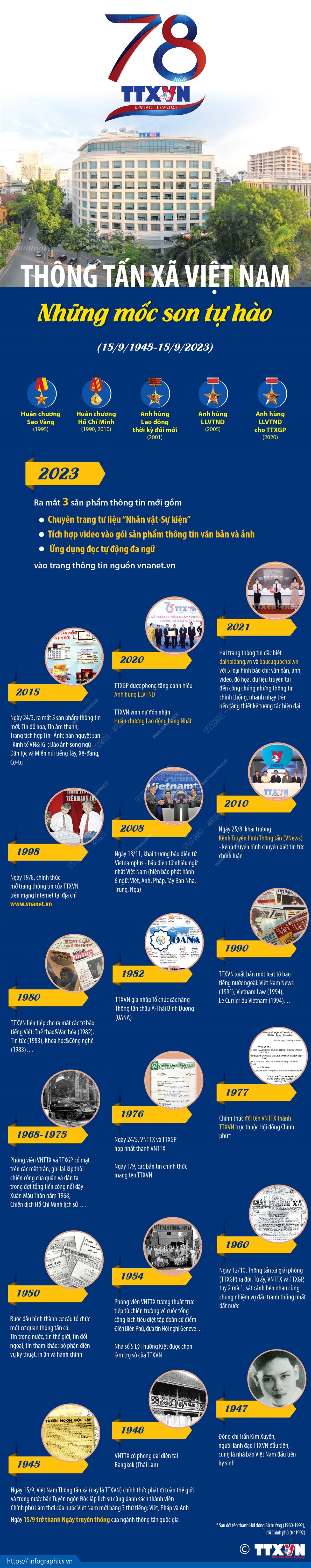 Ngày 15/9/1945, bản Tuyên ngôn Độc lập khai sinh ra nước Việt Nam Dân chủ cộng hòa (nay là CHXHCN Việt Nam) được phát đi toàn thế giới bằng 3 thứ tiếng Việt, Pháp, Anh - đánh dấu sự ra đời của Việt Nam Thông tấn xã (nay là Thông tấn xã Việt Nam), hãng thông tấn đầu tiên trong lịch sử Việt Nam. Trải qua 78 năm phát triển (15/9/1945-15/9/2023), Thông tấn xã Việt Nam luôn thực hiện tốt chức năng thông tấn Nhà nước, cung cấp kịp thời thông tin trong nước, quốc tế cho hệ thống truyền thông trong và ngoài nước với một nguồn tin chính thống được cập nhật liên tục.