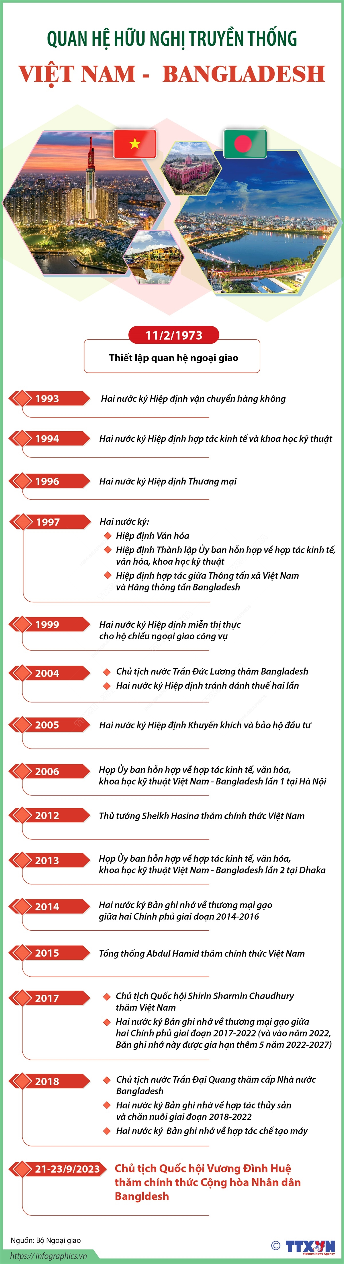 Nhận lời mời của Chủ tịch Quốc hội Cộng hòa Nhân dân Bangladesh Shirin Sharmin Chaudhury, Chủ tịch Quốc hội Vương Đình Huệ thăm chính thức Cộng hòa Nhân dân Bangladesh từ ngày 21 - 23/9/2023. Kể từ khi thiết lập quan hệ ngoại giao ngày 11/2/1973, quan hệ hữu nghị truyền thống Việt Nam và Bangladesh tiếp tục được củng cố và ngày một phát triển. Hoạt động trao đổi đoàn cấp cao duy trì khá đều đặn. Về hợp tác tại các diễn đàn khu vực và quốc tế, hai nước thường có sự trao đổi, hợp tác khá chặt chẽ tại các diễn đàn quốc tế, nhất là tại Liên hợp quốc.