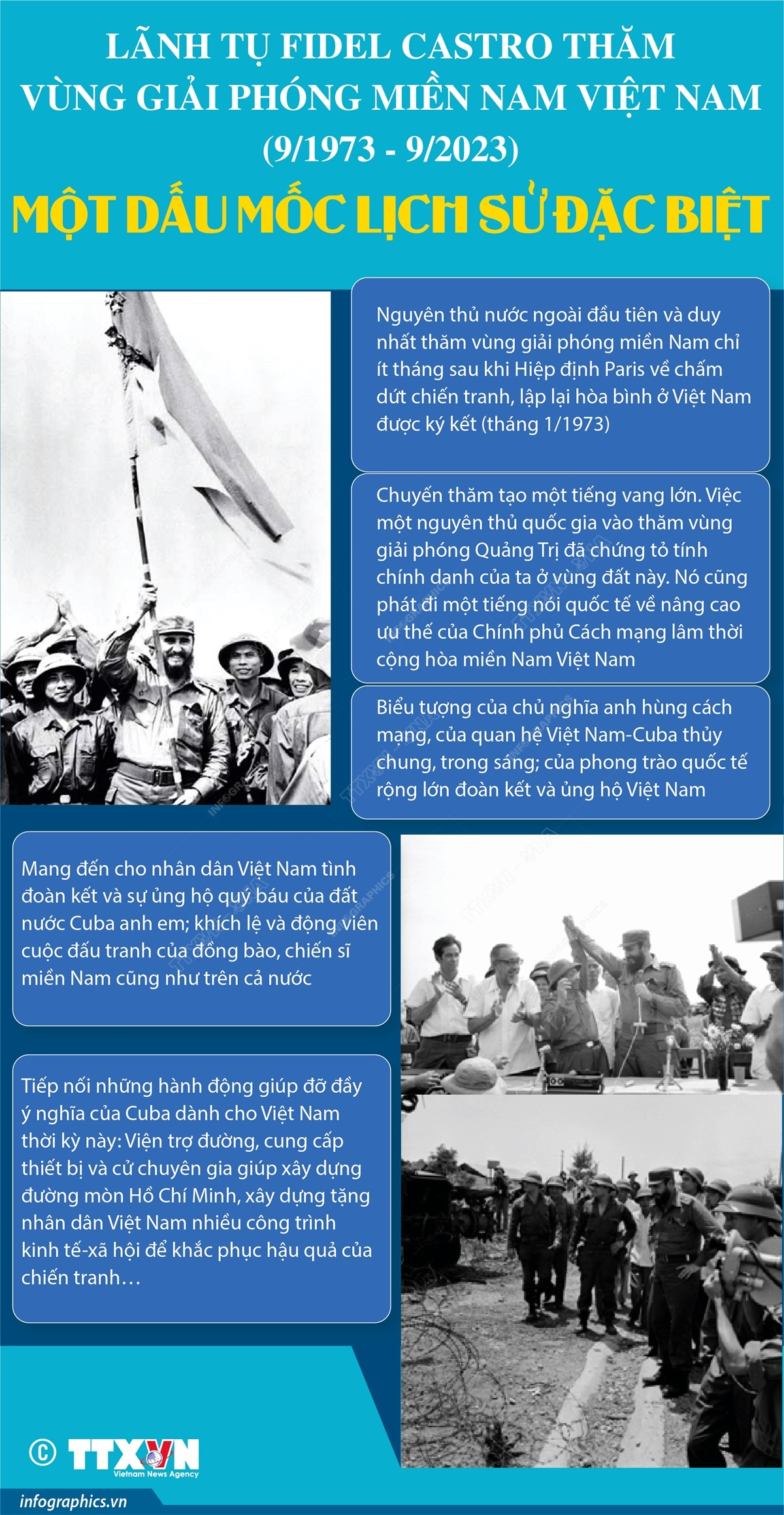 Cách đây 50 năm, tháng 9/1973, khi chiến trường Quảng Trị vẫn còn nồng mùi thuốc súng, từ bên kia bán cầu, Lãnh tụ Cuba Fidel Castro đã đến thăm vùng đất vừa được giải phóng của tỉnh Quảng Trị. Khi ấy, ông là Bí thư Thứ nhất Ban Chấp hành Trung ương Đảng cộng sản Cuba, Thủ tướng Chính phủ cách mạng Cuba. Ông là nguyên thủ nước ngoài đầu tiên và duy nhất thăm vùng giải phóng miền Nam chỉ ít tháng sau khi Hiệp định Paris về chấm dứt chiến tranh, lập lại hòa bình ở Việt Nam được ký kết (tháng 1/1973). Sự kiện Lãnh tụ Fidel Castro tới vùng Giải phóng miền Nam Việt Nam là một dấu mốc lịch sử đặc biệt trong quan hệ hai nước Việt Nam - Cuba, đồng thời là một biểu tượng của phong trào quốc tế đoàn kết và ủng hộ cuộc đấu tranh giải phóng dân tộc của nhân dân Việt Nam