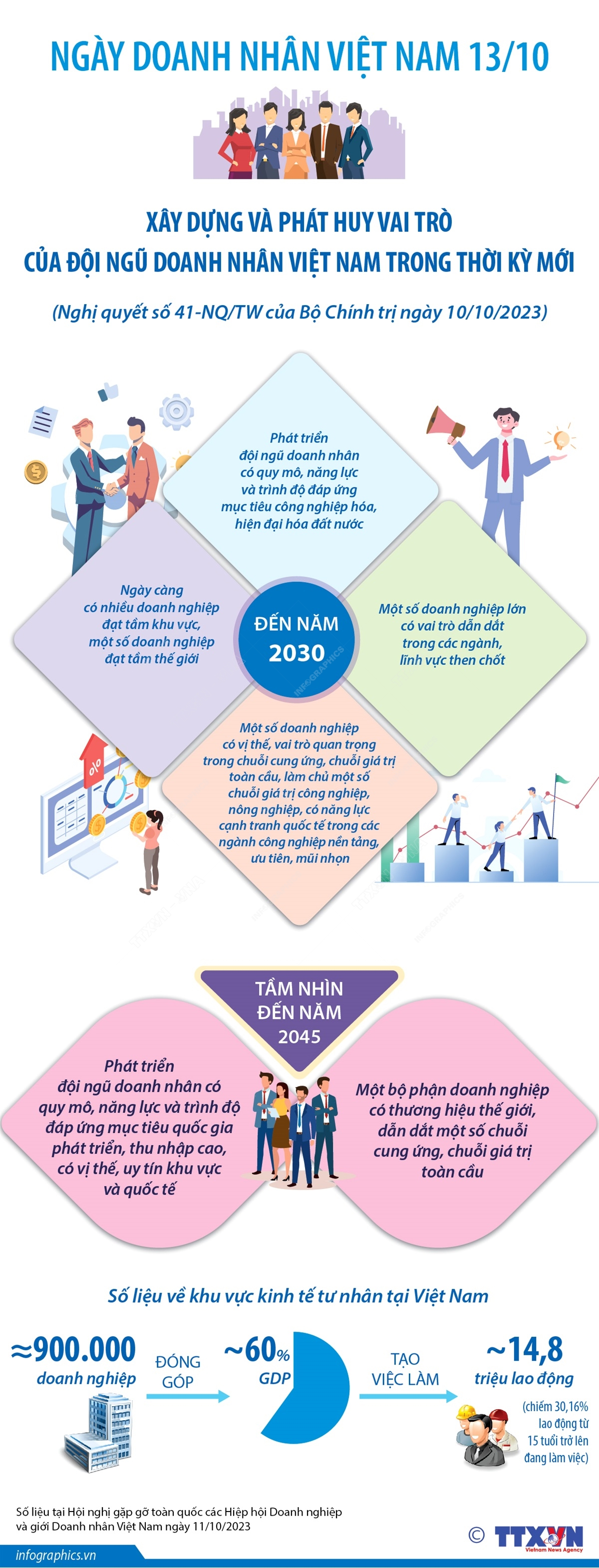 Ngày 10/10/2023, Tổng Bí thư Nguyễn Phú Trọng đã ký Nghị quyết 41-NQ/TW của Bộ Chính trị về xây dựng và phát huy vai trò của đội ngũ doanh nhân Việt Nam trong thời kỳ mới. Nghị quyết đề ra mục tiêu tổng quát: Phát triển đội ngũ doanh nhân lớn mạnh về số lượng, chất lượng, cơ cấu hợp lý, có tầm nhìn, trí tuệ, đạo đức, tinh thần kinh doanh, làm giàu chính đáng, năng động, sáng tạo, năng lực quản trị tiên tiến, tuân thủ pháp luật, có đạo đức, văn hoá kinh doanh mang bản sắc dân tộc có trách nhiệm xã hội, ý thức bảo vệ môi trường, đóng góp xứng đáng cho các mục tiêu phát triển đất nước.