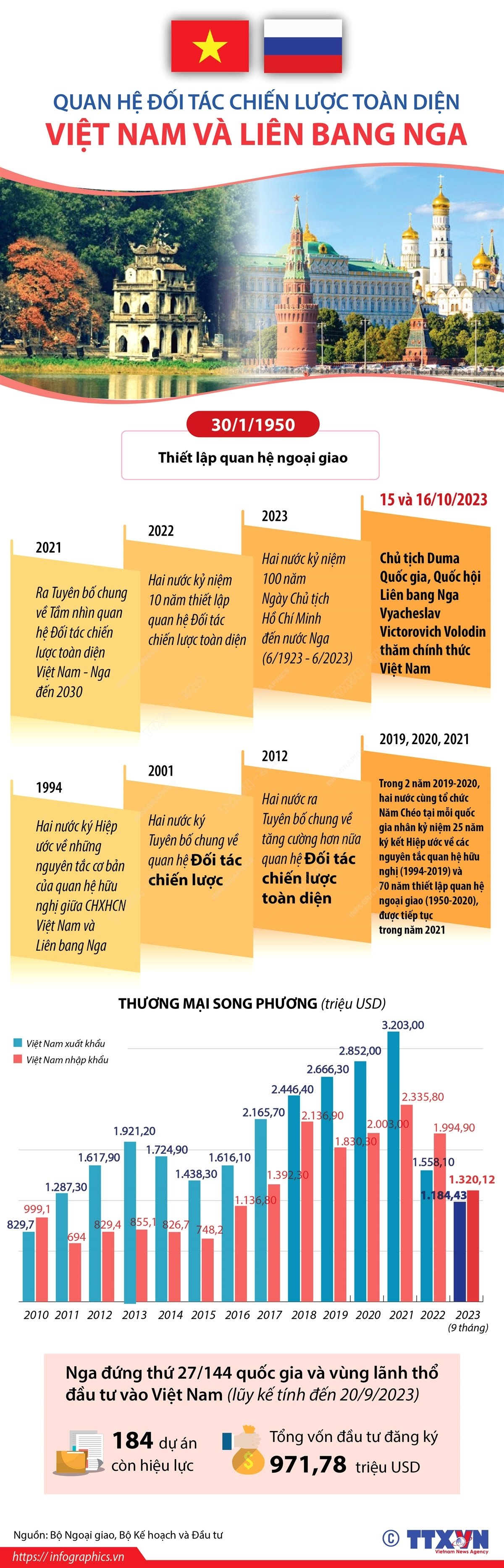 Quan hệ Việt Nam và Liên bang Nga đã trải qua hơn 70 năm hợp tác gắn bó (1950-2023). Quan hệ chính trị giữa hai nước có độ tin cậy cao và không ngừng được củng cố. Trao đổi đoàn cấp cao diễn ra thường xuyên, tạo động lực mạnh mẽ cho việc phát triển quan hệ Đối tác chiến lược toàn diện giữa hai nước. Hợp tác kinh tế-thương mại thời gian qua phát triển năng động với tổng kim ngạch thương mại 9 tháng đầu năm 2023 đạt gần 2,5 tỷ USD. Các mặt hàng xuất khẩu chính của Việt Nam sang Nga gồm: điện thoại, điện tử, dệt may, giầy dép, nông, thủy, hải sản các loại… các mặt hàng nhập khẩu chính gồm: than đá, lúa mì, sắt thép, phân bón, ô tô, máy móc, thiết bị các loại…