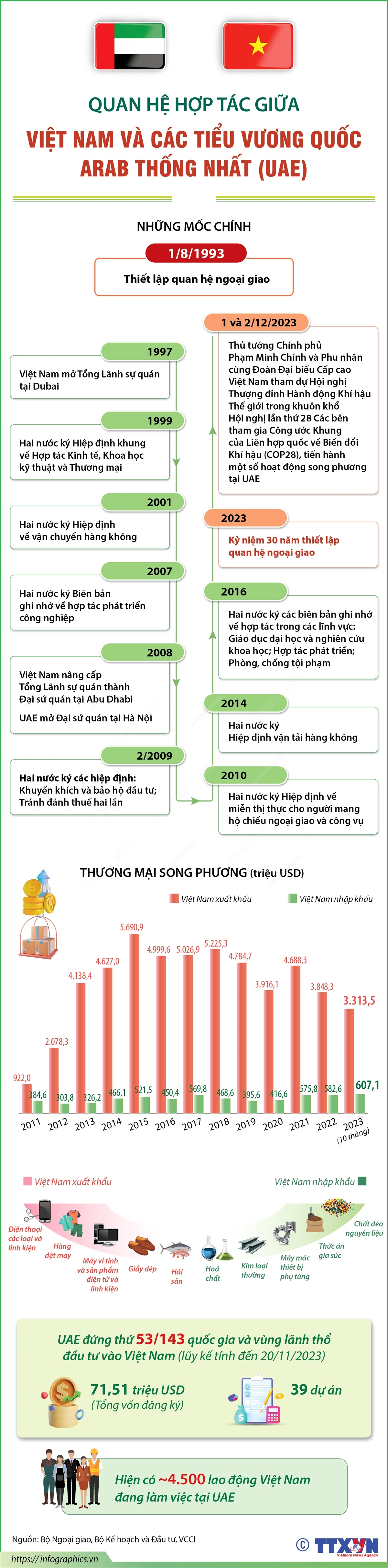 Nhận lời mời của Chính phủ Các Tiểu Vương quốc Arab Thống nhất (UAE), Thủ tướng Chính phủ Phạm Minh Chính và Phu nhân cùng Đoàn Đại biểu Cấp cao Việt Nam sẽ tham dự Hội nghị Thượng đỉnh Hành động Khí hậu Thế giới trong khuôn khổ Hội nghị lần thứ 28 Các bên tham gia Công ước Khung của Liên hợp quốc về Biến đổi Khí hậu (COP28), tiến hành một số hoạt động song phương tại UAE ngày 1 và 2/12/2023. Quan hệ hợp tác giữa Việt Nam và UAE thời gian qua phát triển tốt đẹp. UAE coi Việt Nam là đối tác quan trọng tại khu vực châu Á - Thái Bình Dương, mong muốn tăng cường hợp tác với Việt Nam trên tất cả các lĩnh vực. Đặc biệt, năm 2023 kỷ niệm 30 năm thiết lập quan hệ ngoại giao giữa Việt Nam và UAE.