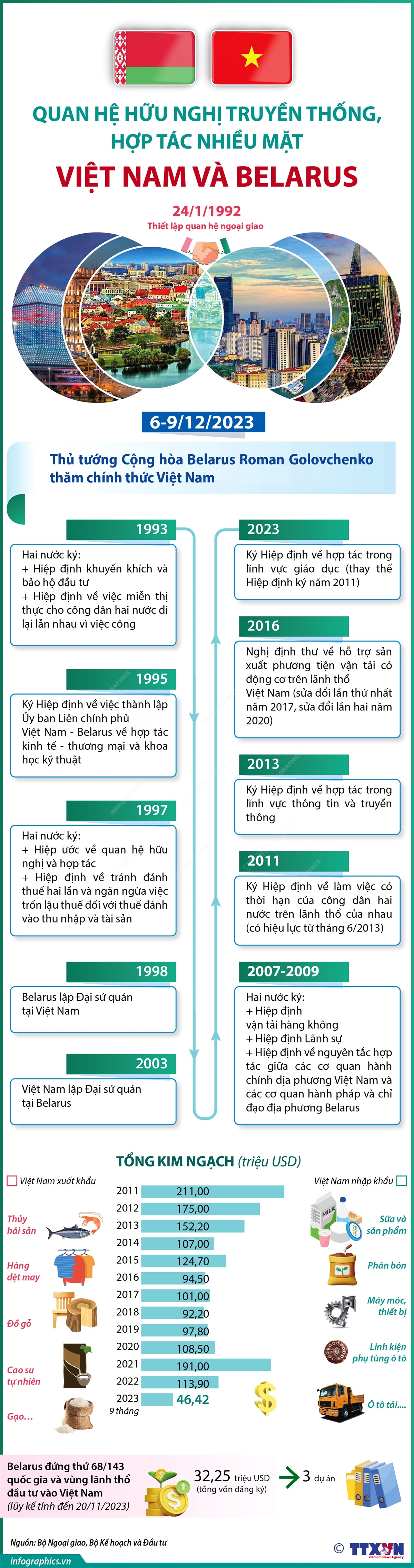 Nhận lời mời của Thủ tướng Chính phủ nước Cộng hòa xã hội chủ nghĩa Việt Nam Phạm Minh Chính, Thủ tướng Cộng hòa Belarus Roman Golovchenko thăm chính thức Việt Nam từ ngày 6 - 9/12/2023. Việt Nam và Belarus kế thừa mối quan hệ hữu nghị truyền thống và hợp tác nhiều mặt tốt đẹp đã có giữa Việt Nam và Liên Xô trước đây. Những năm qua, quan hệ Việt Nam và Belarus luôn được củng cố và phát triển, góp phần quan trọng vào việc xây dựng đất nước ở mỗi quốc gia. Hai bên hợp tác chặt chẽ và ủng hộ lẫn nhau trên các diễn đàn, tổ chức quốc tế, tích cực phối hợp trên các kênh hợp tác liên chính phủ, nghị viện, an ninh-quốc phòng và nhiều lĩnh vực hợp tác khác.