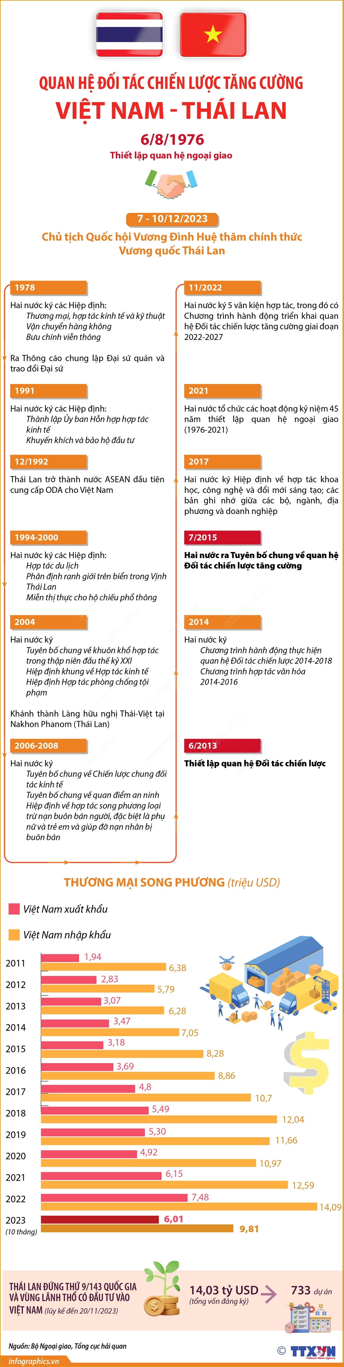 Từ ngày 7 - 10/12/2023, Chủ tịch Quốc hội Vương Đình Huệ thăm chính thức Vương quốc Thái Lan theo lời mời của Chủ tịch Quốc hội Thái Lan Wan Muhamad Noor Matha. Chuyến thăm là một dấu mốc mới trong quan hệ giữa hai quốc gia láng giềng hữu nghị chung dòng sông Mekong, cùng là thành viên Hiệp hội các quốc gia Đông Nam Á (ASEAN). Chuyến thăm nhằm khẳng định mạnh mẽ cam kết, quyết tâm của Việt Nam trong việc tiếp tục tăng cường và phát triển quan hệ đối tác chiến lược tăng cường Việt Nam-Thái Lan lên tầm cao mới, ngày càng đi vào thực chất, hiệu quả.