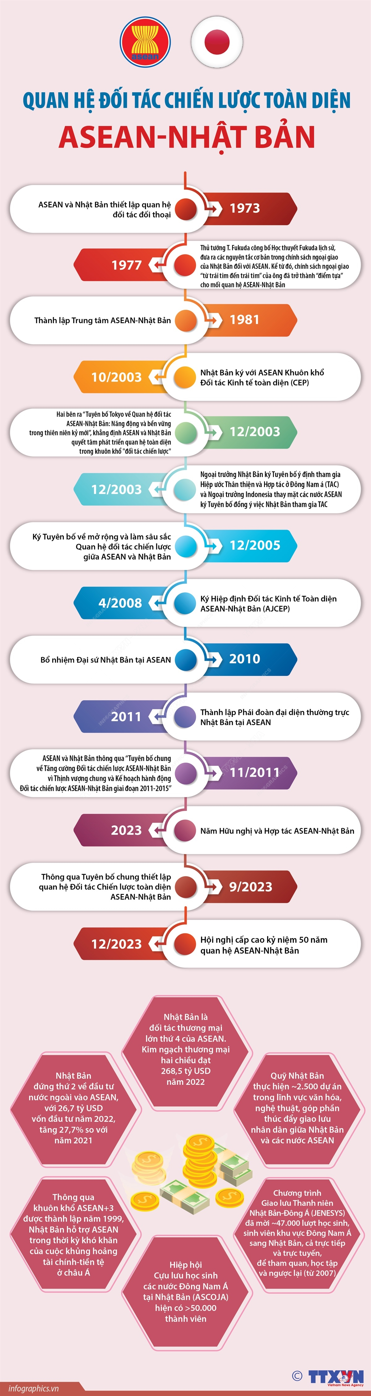 Nhận lời mời của Thủ tướng Nhật Bản Kishida Fumio, Thủ tướng Chính phủ nước Cộng hòa xã hội chủ nghĩa Việt Nam Phạm Minh Chính dẫn đầu Đoàn đại biểu cấp cao Việt Nam tham dự Hội nghị cấp cao kỷ niệm 50 năm quan hệ ASEAN - Nhật Bản và tiến hành các hoạt động song phương tại Nhật Bản từ ngày 15 đến ngày 18/12/2023. Qua 50 năm, quan hệ ASEAN-Nhật Bản phát triển toàn diện, năng động trên tất cả các lĩnh vực (chính trị-an ninh, kinh tế-thương mại-đầu tư, văn hóa-xã hội và hợp tác phát triển). Nhật Bản được đánh giá là đối tác tin cậy, thực chất và hiệu quả, là nhà đầu tư trực tiếp nước ngoài lớn thứ hai và đối tác thương mại lớn thứ tư của ASEAN; ủng hộ đoàn kết, thống nhất và vai trò trung tâm của ASEAN; có nhiều hoạt động hợp tác thiết thực hỗ trợ ASEAN xây dựng cộng đồng.