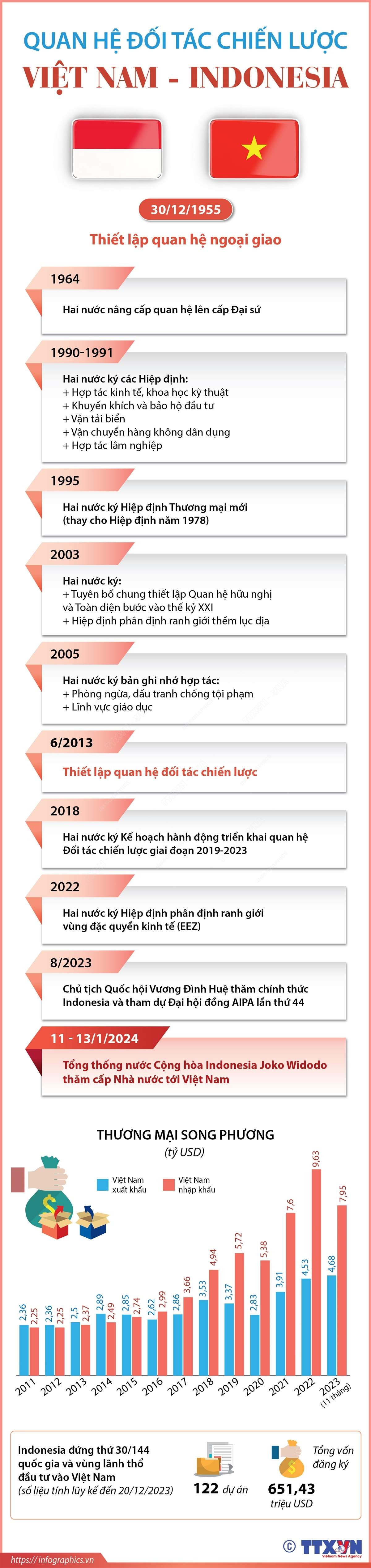 Nhận lời mời của Chủ tịch nước Cộng hòa xã hội chủ nghĩa Việt Nam Võ Văn Thưởng, Tổng thống nước Cộng hòa Indonesia Joko Widodo thăm cấp Nhà nước tới Việt Nam từ ngày 11 - 13/1/2024. Kể từ khi thiết lập quan hệ ngoại giao (30/12/1955) đến nay, quan hệ Việt Nam - Indonesia phát triển thuận lợi và tích cực. Hai bên thường xuyên trao đổi đoàn và tiếp xúc cấp cao; duy trì phối hợp lập trường chặt chẽ tại các diễn đàn khu vực và quốc tế, đặc biệt là tại ASEAN, Liên hợp quốc, APEC, Phong trào không liên kết… Năm 2013, hai nước nâng cấp quan hệ song phương lên Ðối tác chiến lược. Indonesia hiện là đối tác thương mại lớn thứ 3 của Việt Nam và Việt Nam là đối tác thương mại lớn thứ 4 của Indonesia trong ASEAN.