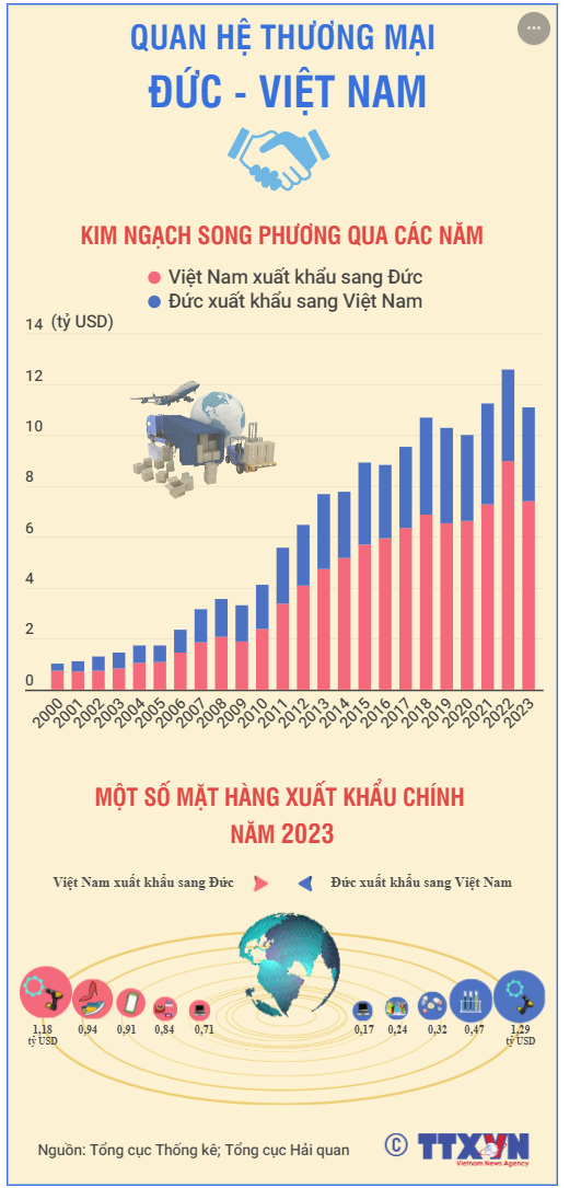 Trong những năm qua, với đặc thù cơ cấu hàng hóa bổ sung cho nhau là chủ yếu, quan hệ thương mại giữa Việt Nam và Đức liên tục phát triển và đạt được nhiều thành tựu đáng ghi nhận. Tổng kim ngạch xuất nhập khẩu giữa 2 nước năm 2023 đạt trên 11 tỷ, trong đó Việt Nam xuất khẩu 7,4 tỷ USD, Việt Nam nhập khẩu gần 3,7 tỷ USD.