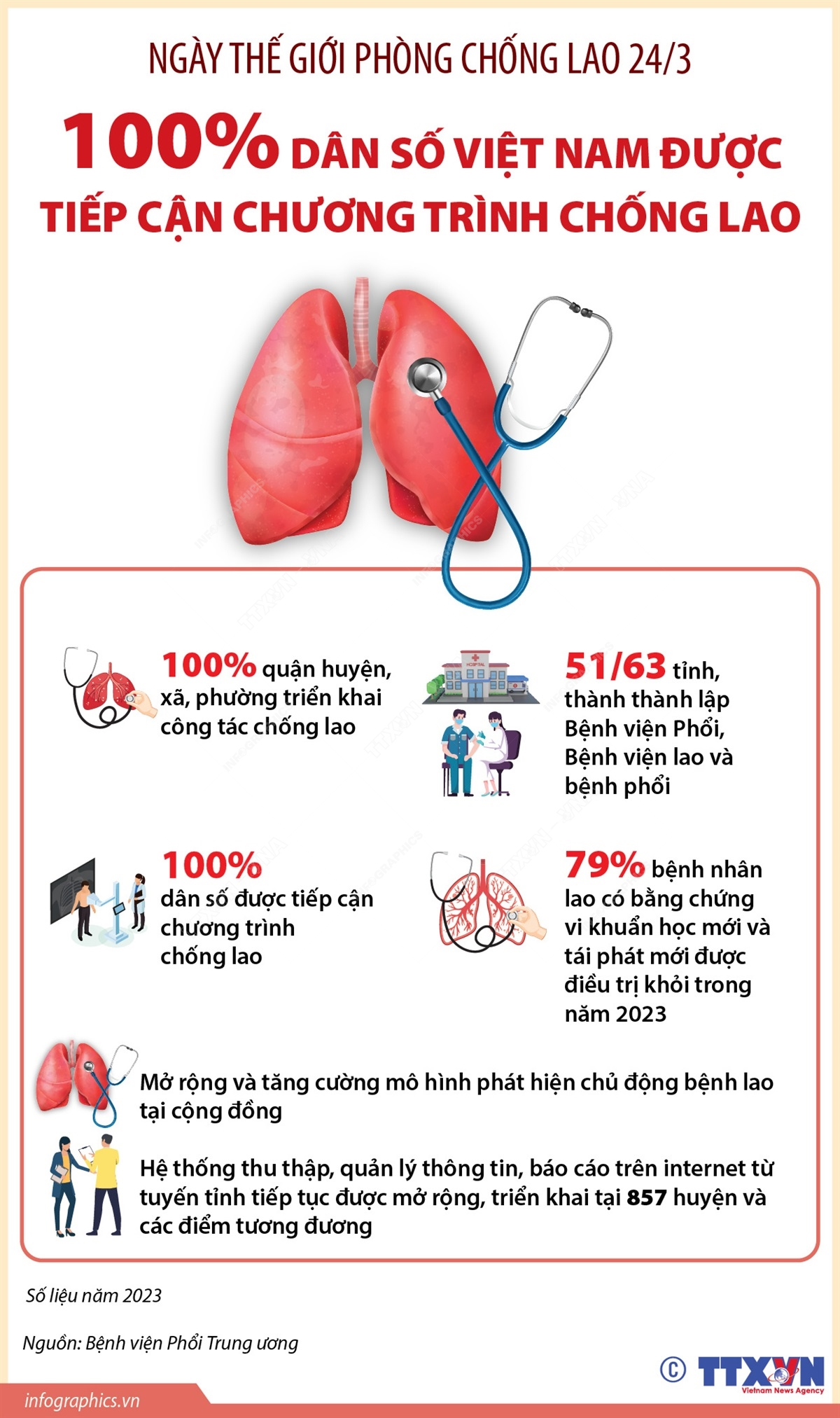 Ngày 24/3 hằng năm là Ngày Thế giới Phòng chống lao nhằm nâng cao nhận thức của cộng đồng về những ảnh hưởng nghiêm trọng của bệnh lao tới sức khỏe con người, kinh tế và xã hội, đồng thời thúc đẩy nỗ lực chấm dứt bệnh lao trên toàn cầu. Chủ đề Ngày thế giới phòng chống lao năm 2024 của Việt Nam là “Đúng! Việt Nam có thể chấm dứt bệnh lao”, thể hiện quyết tâm cao của cộng đồng trong cuộc chiến đẩy lùi bệnh lao. Trong năm qua, Chương trình Chống Lao quốc gia đã đạt được nhiều kết quả đáng ghi nhận. Chương trình chống lao vẫn duy trì mục tiêu triển khai công tác tại 100% số quận, huyện và 100% số xã, phường. Tỷ lệ dân số được chương trình chống lao tiếp cận đạt 100%. Hiện nay 51/63 tỉnh, thành phố trên toàn quốc đã thành lập Bệnh viện Phổi, Bệnh viện lao và bệnh phổi…