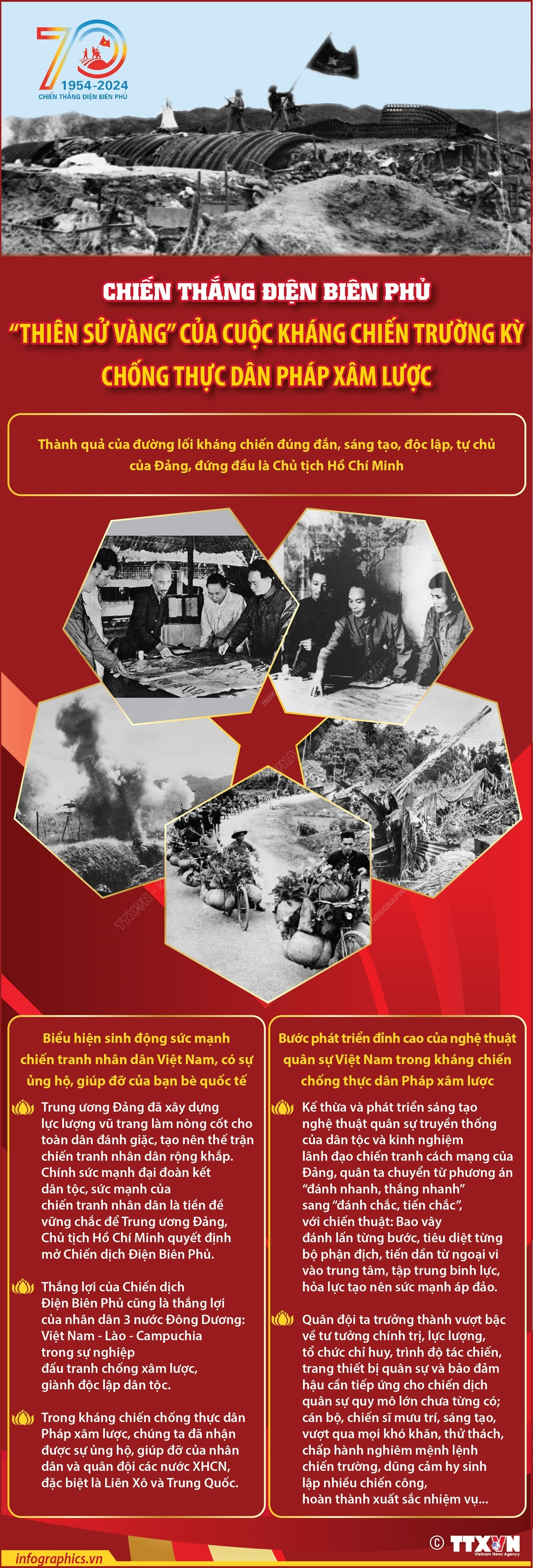Cách đây tròn 70 năm, dưới sự lãnh đạo đúng đắn, sáng tạo của Đảng, quân và dân ta đã làm nên chiến thắng lịch sử Điện Biên Phủ - đỉnh cao của chiến cuộc Đông Xuân 1953-1954, là thắng lợi lớn nhất của quân đội và nhân dân Việt Nam trong kháng chiến chống thực dân Pháp xâm lược (1945-1954). Chiến thắng Điện Biên Phủ đã chấm dứt chiến tranh, lập lại hòa bình ở Đông Dương; “được ghi vào lịch sử dân tộc như một Bạch Đằng, một Chi Lăng hay Đống Đa trong thế kỷ XX và đi vào lịch sử thế giới như một chiến công chói lọi, đột phá thành trì của hệ thống nô dịch thuộc địa của chủ nghĩa đế quốc”.