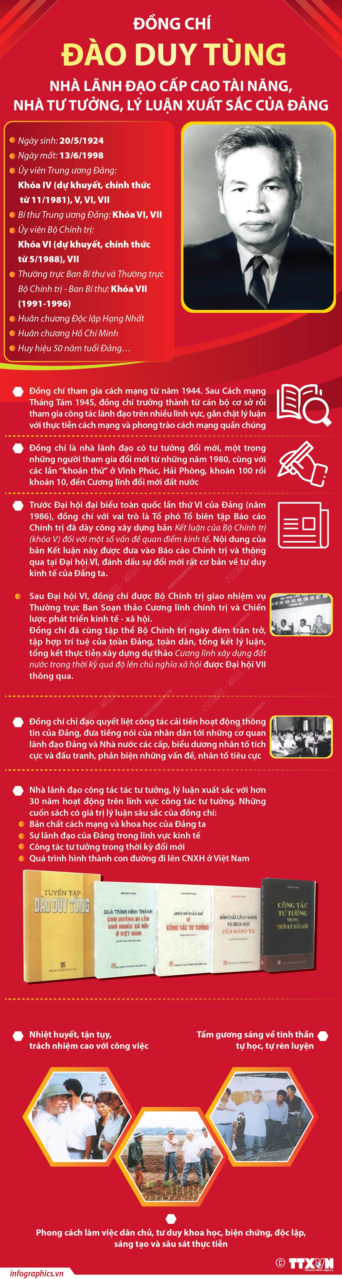 Với 74 tuổi đời, hơn 50 năm hoạt động cách mạng, đồng chí Đào Duy Tùng là nhà tư tưởng, lý luận xuất sắc hàng đầu của Đảng, đặc biệt có những đóng góp nổi bật trong những bước ngoặt của cách mạng Việt Nam. Đồng chí đi tiên phong trong sự nghiệp đổi mới từ những năm 1980, cùng với những lần “khoán thử” ở Vĩnh Phúc, Hải Phòng, “khoán 100”, “khoán 10”, rồi đến “Cương lĩnh xây dựng đất nước trong thời kỳ quá độ lên chủ nghĩa xã hội”, “Chiến lược phát triển kinh tế - xã hội” mới, mà đồng chí làm thường trực Tiểu ban biên soạn, được Đại Đảng lần thứ VII (1991) thông qua. Đồng chí đã nêu gương sáng về người chiến sĩ cộng sản kiên trung, một nhà lãnh đạo cao cấp tài năng, đổi mới của Đảng, có nhiều cống hiến xuất sắc trên mặt trận tư tưởng, lý luận; một tấm gương đạo đức cách mạng cao đẹp. Đồng chí Đào Duy Tùng sinh ngày 20/5/1924, cách đây 100 năm.