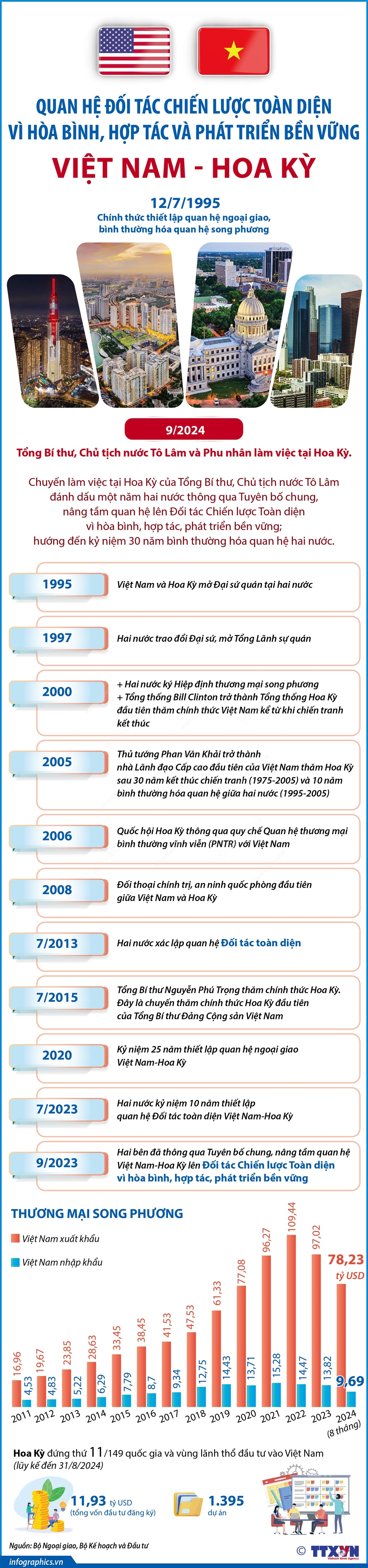 Từ ngày 21/9/2024, Tổng Bí thư, Chủ tịch nước Tô Lâm và phu nhân cùng đoàn đại biểu cấp cao Việt Nam tham dự Hội nghị thượng đỉnh Tương lai, Đại hội đồng Liên hợp quốc Khóa 79 và làm việc tại Hoa Kỳ. Chuyến làm việc tại Hoa Kỳ của Tổng Bí thư, Chủ tịch nước Tô Lâm đánh dấu một năm hai nước thông qua Tuyên bố chung, nâng tầm quan hệ lên Đối tác Chiến lược Toàn diện vì hòa bình, hợp tác, phát triển bền vững; hướng đến kỷ niệm 30 năm bình thường hóa quan hệ hai nước.