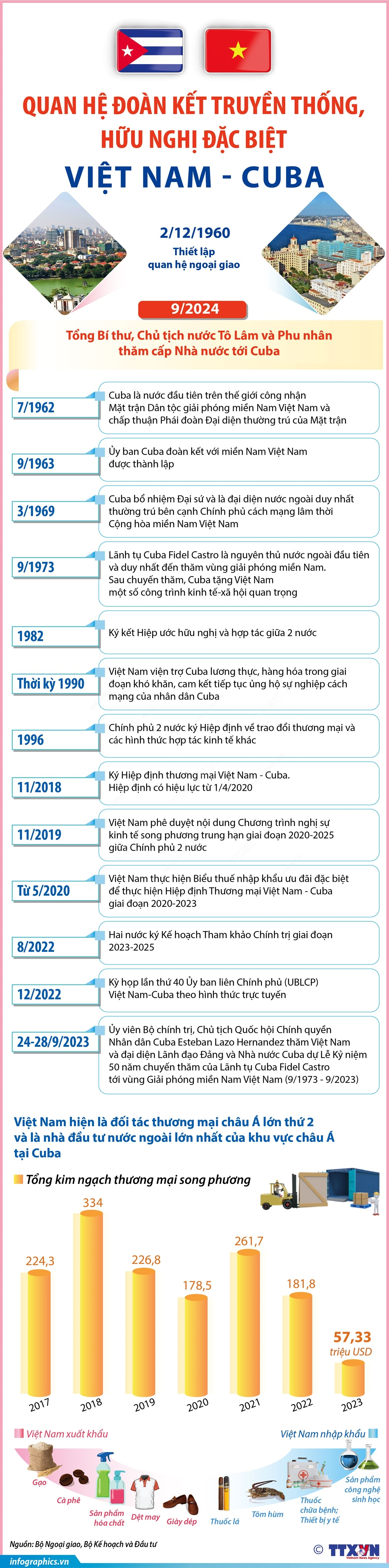 Tháng 9/2024, Tổng Bí thư Ban Chấp hành Trung ương Đảng Cộng sản Việt Nam, Chủ tịch nước Cộng hòa xã hội chủ nghĩa Việt Nam Tô Lâm và Phu nhân cùng đoàn đại biểu cấp cao Việt Nam thăm cấp Nhà nước tới Cuba theo lời mời của Bí thư thứ nhất Ban Chấp hành Trung ương Đảng Cộng sản Cuba, Chủ tịch nước Cộng hòa Cuba Miguel Diaz Canel Bermudez cùng Phu nhân. Quan hệ đoàn kết truyền thống, hữu nghị đặc biệt Việt Nam - Cuba là di sản quý báu, được Đảng, Nhà nước và Nhân dân hai nước hết sức coi trọng, tiếp tục phát triển tốt đẹp trên tất cả các kênh.