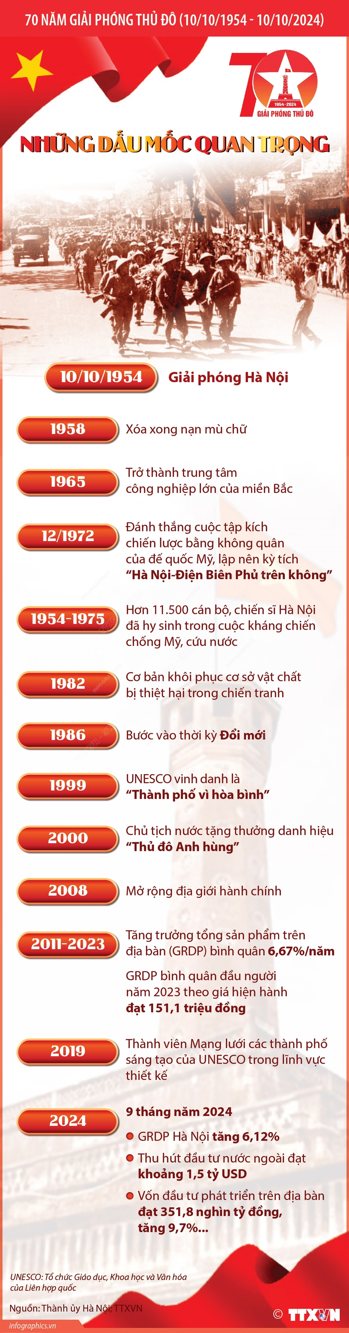 70 năm trước, ngày 10/10/1954, Thủ đô Hà Nội được giải phóng, mở đầu thời kỳ xây dựng chủ nghĩa xã hội ở miền Bắc và đấu tranh giải phóng miền Nam, thống nhất đất nước. Lịch sử của Thủ đô Hà Nội luôn gắn liền với lịch sử đấu tranh giải phóng dân tộc cũng như công cuộc xây dựng, kiến thiết đất nước ngày nay. 70 năm qua, Hà Nội đã vươn lên trở thành một trong những đô thị lớn của khu vực Đông Nam Á, với tốc độ tăng trưởng kinh tế nhanh, bền vững, thực sự là Thủ đô nghìn năm văn hiến, nơi lắng đọng hào khí Thăng Long, hồn thiêng sông núi, nơi kết tinh và tỏa sáng trí tuệ Việt Nam.