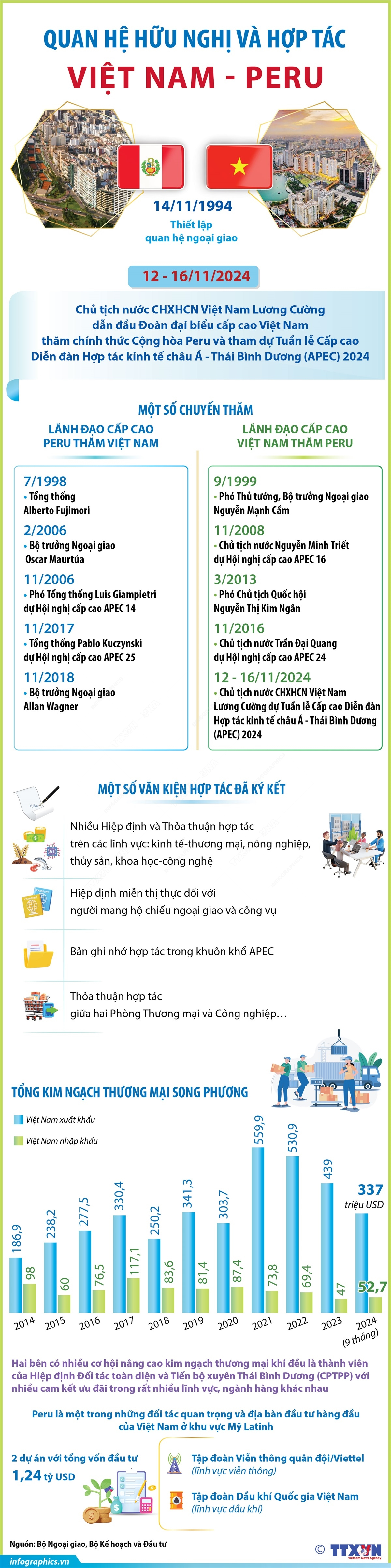 Nhận lời mời của Tổng thống Cộng hòa Peru Dina Ercilia Boluarte Zegarra, Chủ tịch nước Cộng hòa xã hội chủ nghĩa Việt Nam Lương Cường dẫn đầu Đoàn đại biểu cấp cao Việt Nam thăm chính thức Cộng hòa Peru và tham dự Tuần lễ Cấp cao Diễn đàn Hợp tác kinh tế châu Á - Thái Bình Dương (APEC) 2024 tại Lima, Peru từ ngày 12 - 16/11/2024. Đây là chuyến thăm chính thức đầu tiên của lãnh đạo cấp cao Việt Nam tới Peru, diễn ra đúng dịp hai nước kỷ niệm 30 năm thiết lập quan hệ ngoại giao (14/11/1994-14/11/2024).