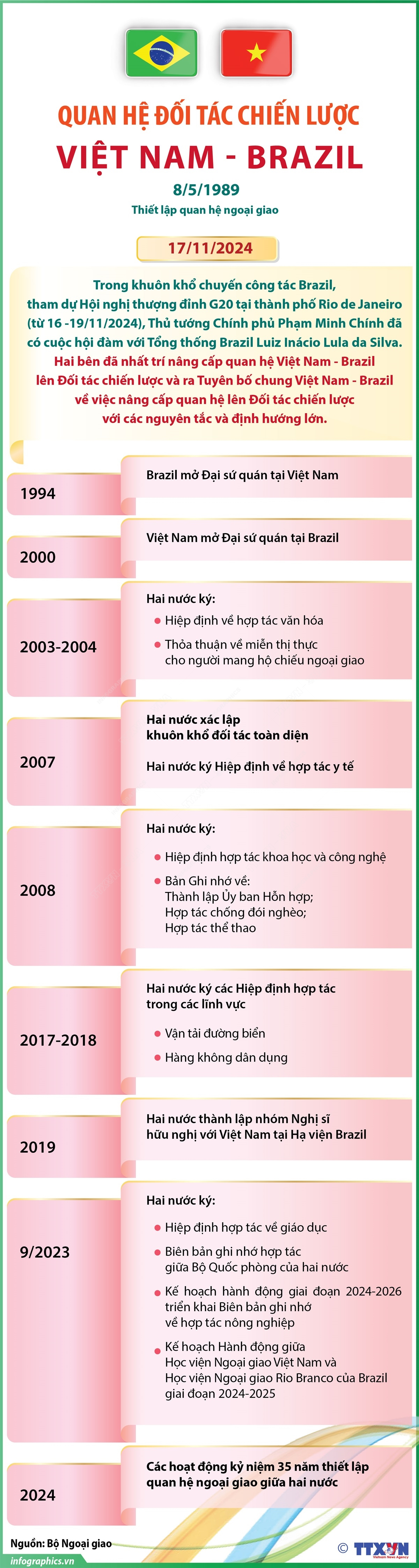 Trong khuôn khổ chuyến công tác Brazil, tham dự Hội nghị thượng đỉnh G20 tại thành phố Rio de Janeiro (từ ngày 16 đến 19/11/2024), Thủ tướng Chính phủ Phạm Minh Chính đã có cuộc hội đàm với Tổng thống Brazil, Luiz Inácio Lula da Silva. Hai bên đã nhất trí nâng cấp quan hệ Việt Nam - Brazil lên Đối tác chiến lược và ra Tuyên bố chung Việt Nam - Brazil về việc nâng cấp quan hệ lên Đối tác chiến lược với các nguyên tắc và định hướng lớn.