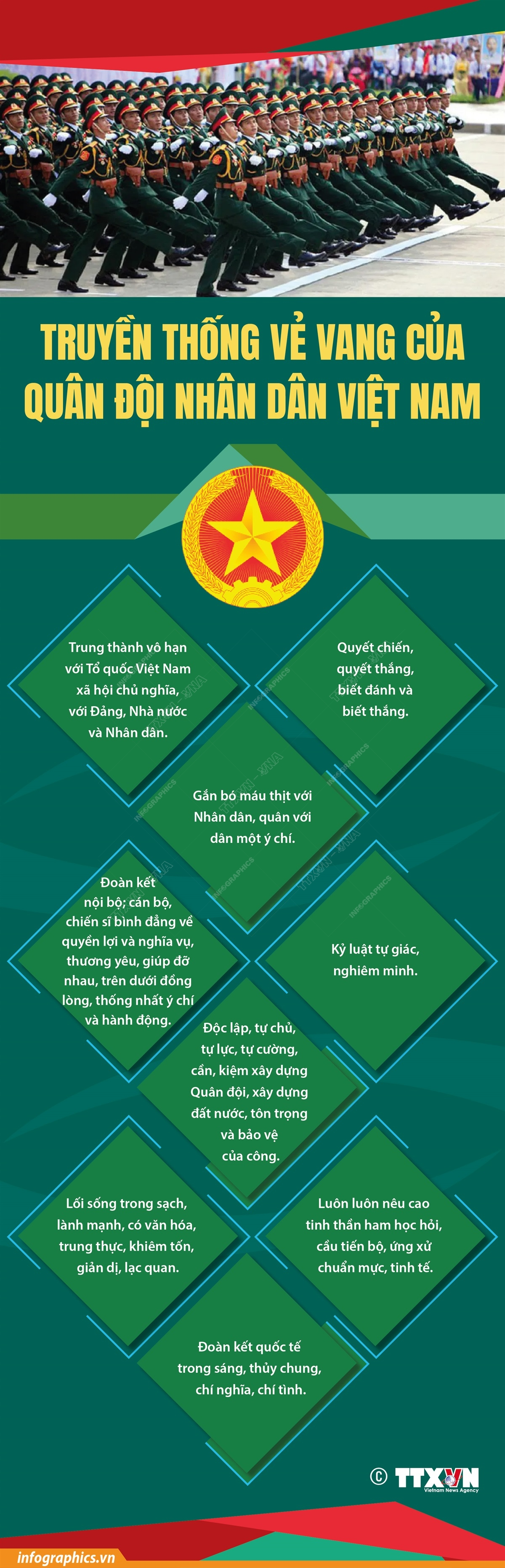 Trải qua 80 năm xây dựng, chiến đấu, chiến thắng và trưởng thành (1944-2024), dưới sự lãnh đạo, chỉ đạo, giáo dục, rèn luyện của Đảng ta, đứng đầu là Chủ tịch Hồ Chí Minh, sự đùm bọc, giúp đỡ của nhân dân, Quân đội nhân dân Việt Nam đã không ngừng lớn mạnh, trưởng thành, giữ vững và phát huy bản chất, truyền thống “Bộ đội Cụ Hồ”, thực hiện tốt chức năng là đội quân chiến đấu, đội quân công tác và đội quân lao động sản xuất, hoàn thành xuất sắc mọi nhiệm vụ mà Đảng, Nhà nước và nhân dân giao phó. Quân đội nhân dân Việt Nam đã xây đắp nên truyền thống rất vẻ vang, được khái quát cô đọng trong lời khen ngợi của Chủ tịch Hồ Chí Minh: “Quân đội ta trung với Đảng, hiếu với dân, sẵn sàng chiến đấu, hy sinh vì độc lập, tự do của Tổ quốc, vì chủ nghĩa xã hội. Nhiệm vụ nào cũng hoàn thành, khó khăn nào cũng vượt qua, kẻ thù nào cũng đánh thắng”.