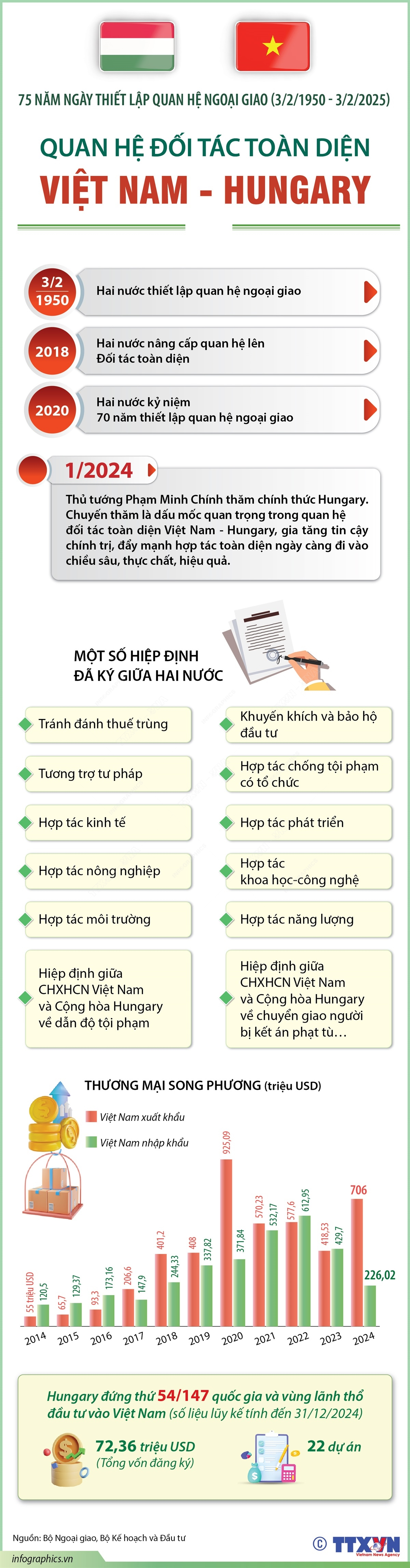 Quan hệ hữu nghị Việt Nam-Hungary có bề dày lịch sử 75 năm. Hai nước chính thức thiết lập quan hệ ngoại giao ngày 3/2/1950. Kể từ đó đến nay, quan hệ hữu nghị truyền thống và hợp tác nhiều mặt của hai nước có những bước phát triển mạnh mẽ. Đặc biệt, tháng 9/2018, quan hệ hai nước được nâng tầm lên “Đối tác toàn diện” đã tạo khuôn khổ phát triển cao hơn, tạo động lực làm sâu sắc hơn nữa quan hệ truyền thống, hợp tác nhiều mặt, tăng cường sự hiểu biết và tin cậy lẫn nhau giữa lãnh đạo và nhân dân hai nước.