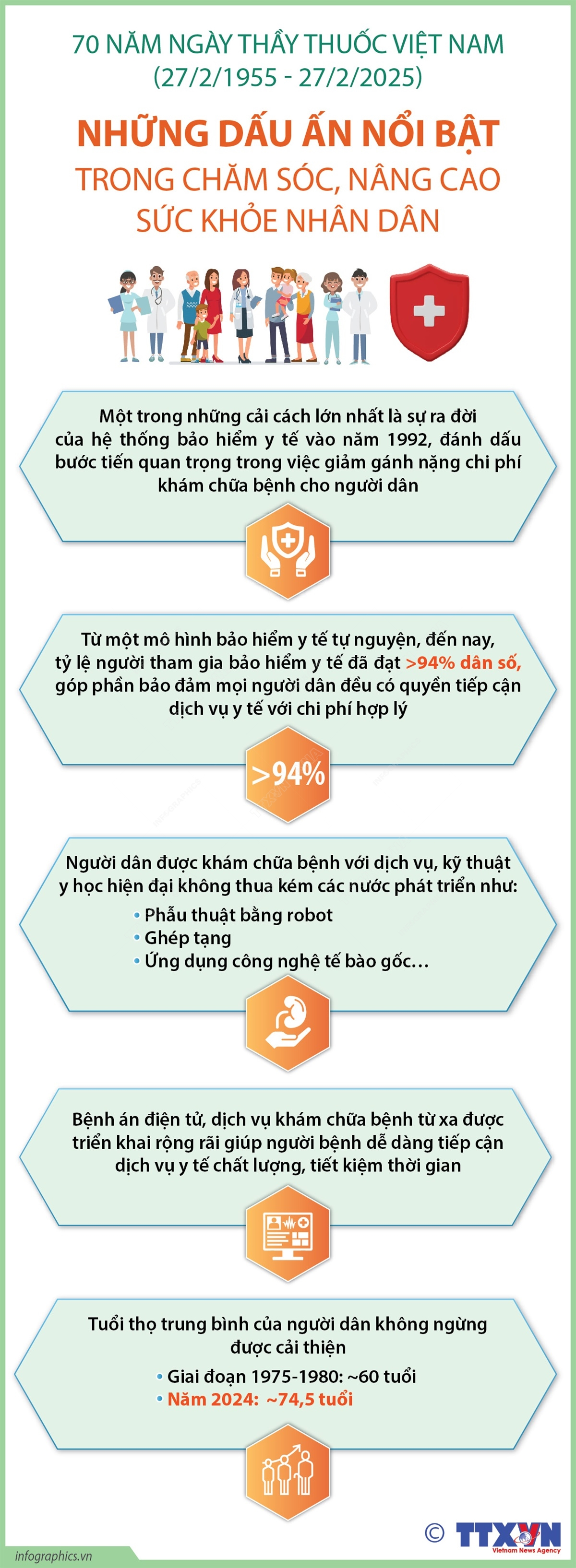 Một trong những sứ mệnh quan trọng nhất của ngành y tế là thực hiện nhiệm vụ bảo vệ, chăm sóc sức khỏe nhân dân, sức khỏe cộng đồng, mang lại cuộc sống khỏe mạnh, hạnh phúc cho mọi người dân, tạo được nguồn nhân lực chất lượng tốt cho xã hội. Trải qua 70 năm xây dựng, lao động, cống hiến và trưởng thành (27/2/1955 - 27/2/2025), ngành y tế Việt Nam đã có những bước tiến vượt bậc cả về số lượng và chất lượng, đáp ứng nhu cầu ngày một cao hơn về chăm sóc y tế, khám chữa bệnh cho người dân.