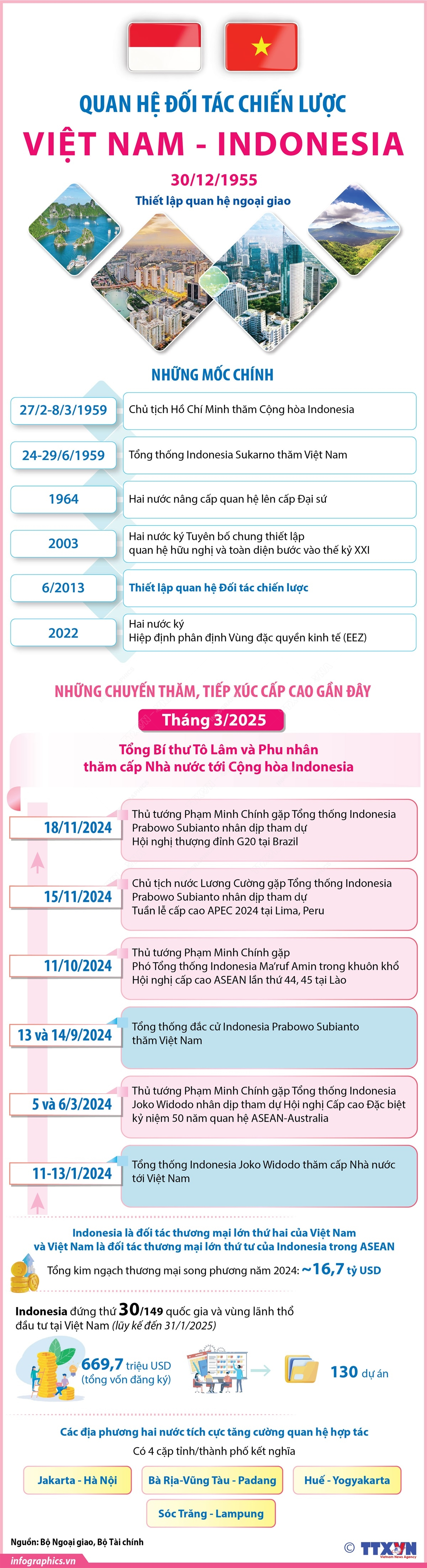 Nhận lời mời của Tổng thống Cộng hòa Indonesia, Chủ tịch Đảng Phong trào Indonesia vĩ đại (Gerindra) Prabowo Subianto, Tổng Bí thư Ban Chấp hành Trung ương Đảng Cộng sản Việt Nam Tô Lâm và Phu nhân thăm cấp Nhà nước tới Cộng hòa Indonesia từ ngày 9 đến ngày 13/3/2025. Quan hệ giữa Việt Nam và Indonesia được Tổng thống Sukarno và Chủ tịch Hồ Chí Minh xây dựng, là tài sản vô giá của hai dân tộc. Hai nước đã mở rộng quan hệ trên mọi lĩnh vực và trở thành đối tác chiến lược của nhau năm 2013. Hai nước đang hướng tới mục tiêu đưa kim ngạch thương mại song phương đạt 18 tỷ USD vào năm 2028.