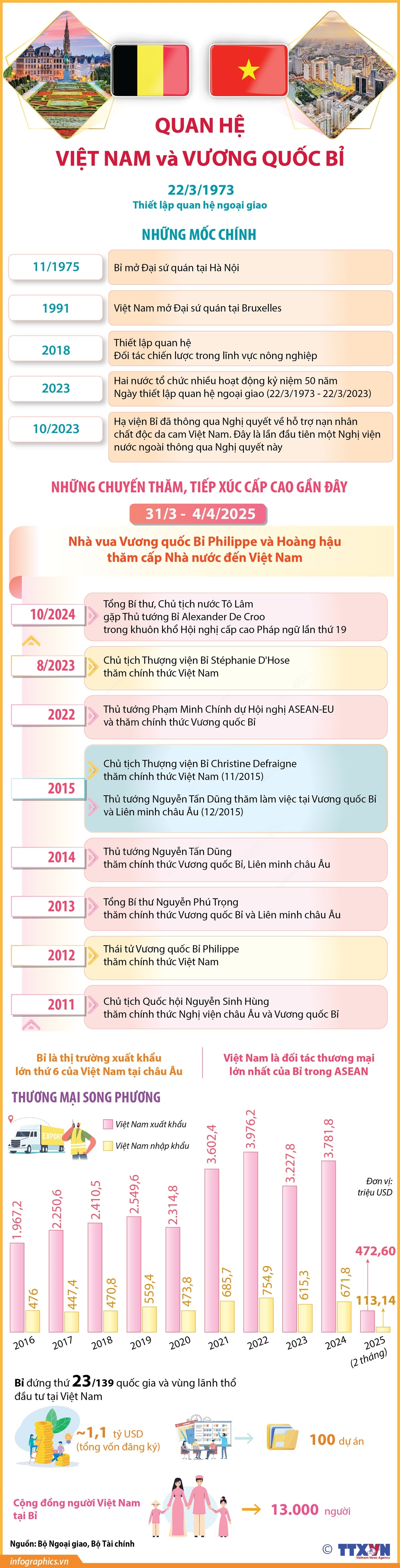 Nhận lời mời của Chủ tịch nước Cộng hòa xã hội chủ nghĩa Việt Nam Lương Cường và Phu nhân, Nhà vua Vương quốc Bỉ Philippe và Hoàng hậu thăm cấp Nhà nước đến Việt Nam từ ngày 31/3 đến ngày 4/4/2025. Việt Nam và Vương quốc Bỉ chính thức thiết lập quan hệ ngoại giao vào ngày 22/3/1973, chỉ hai tháng sau khi Hiệp định Paris được ký kết. Hơn 50 năm qua, quan hệ song phương giữa hai nước không ngừng được củng cố, phát triển tốt đẹp trên các lĩnh vực, nhất là chính trị-ngoại giao, thương mại, nông nghiệp, giáo dục đào tạo, hợp tác khoa học-công nghệ, hợp tác phát triển... ở cả cấp liên bang, vùng và cộng đồng.